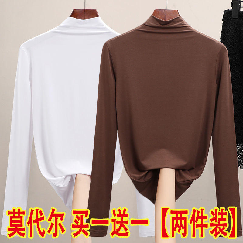 單/兩件裝 莫代爾長袖t恤女春秋冬修身百搭半高領打底衫內搭上衣