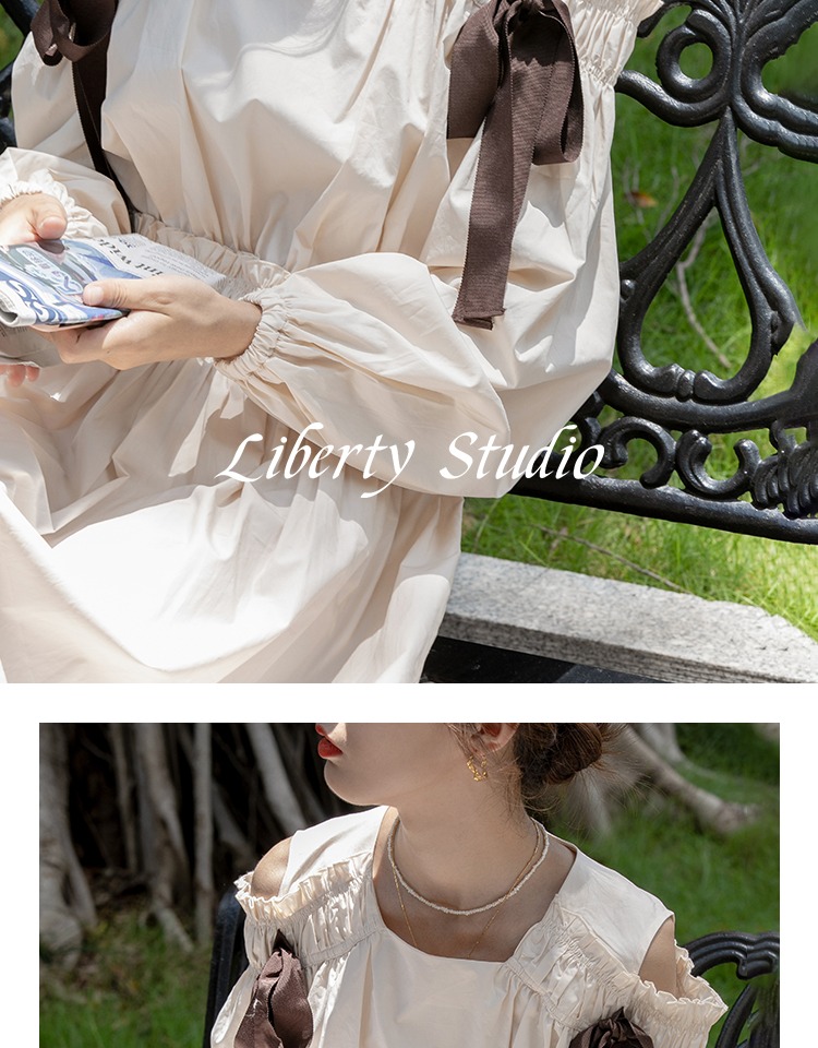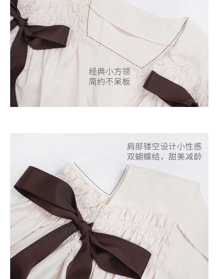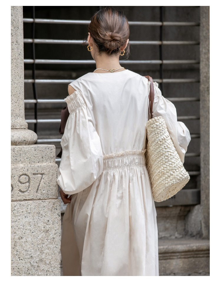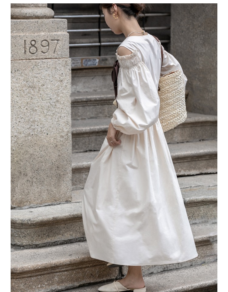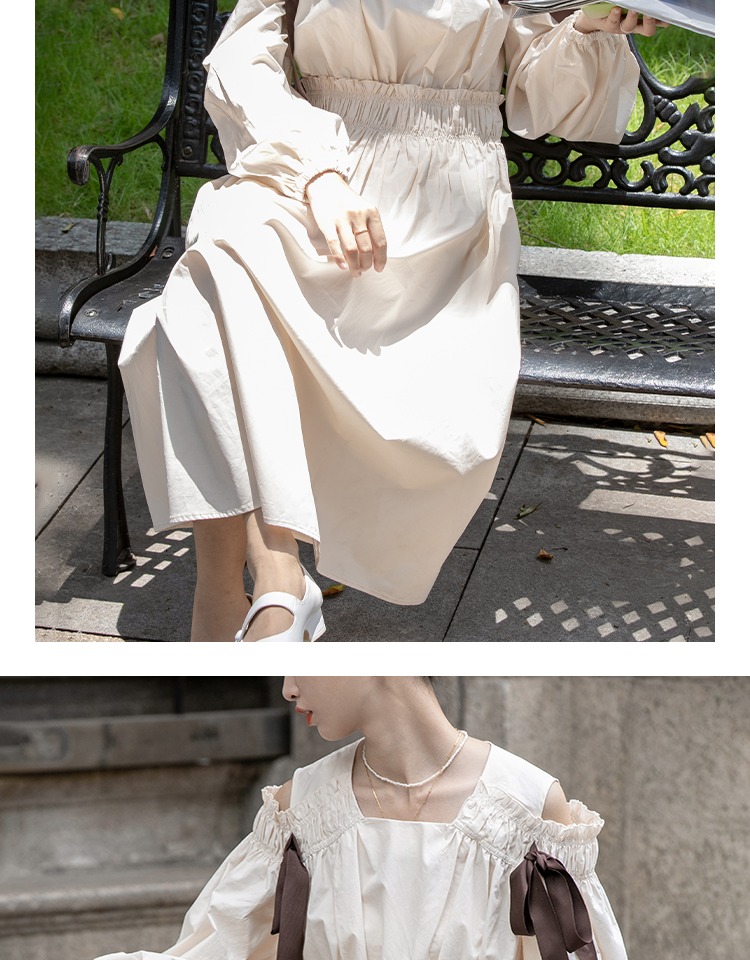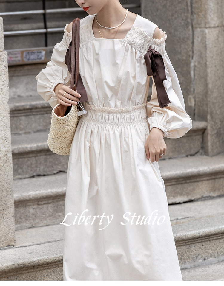 無拘2023年秋季鏤空露肩多巴胺中長裙白色簡約時尚蝴蝶結連衣裙女