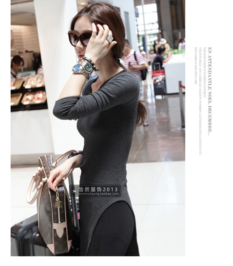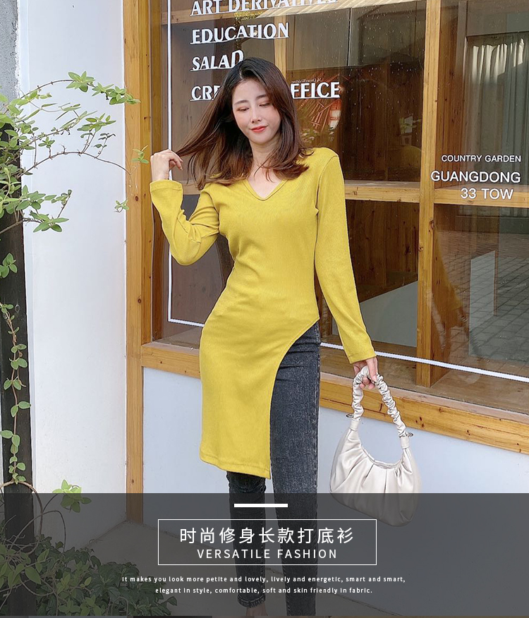 中長款T恤女韓式大碼上衣設計感開叉不對稱遮屁股黃色打底衫秋冬
