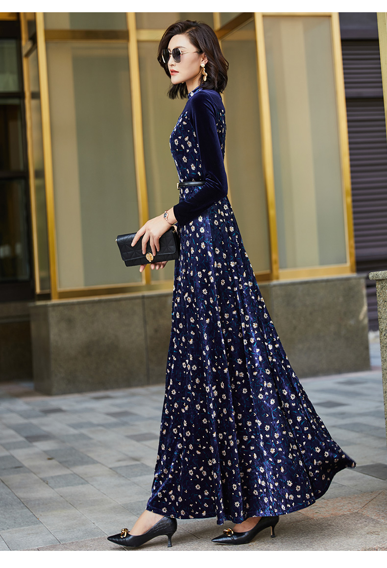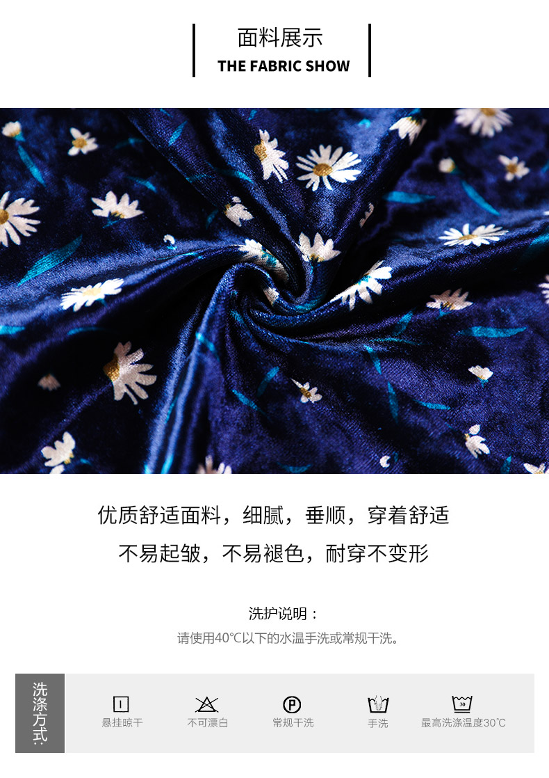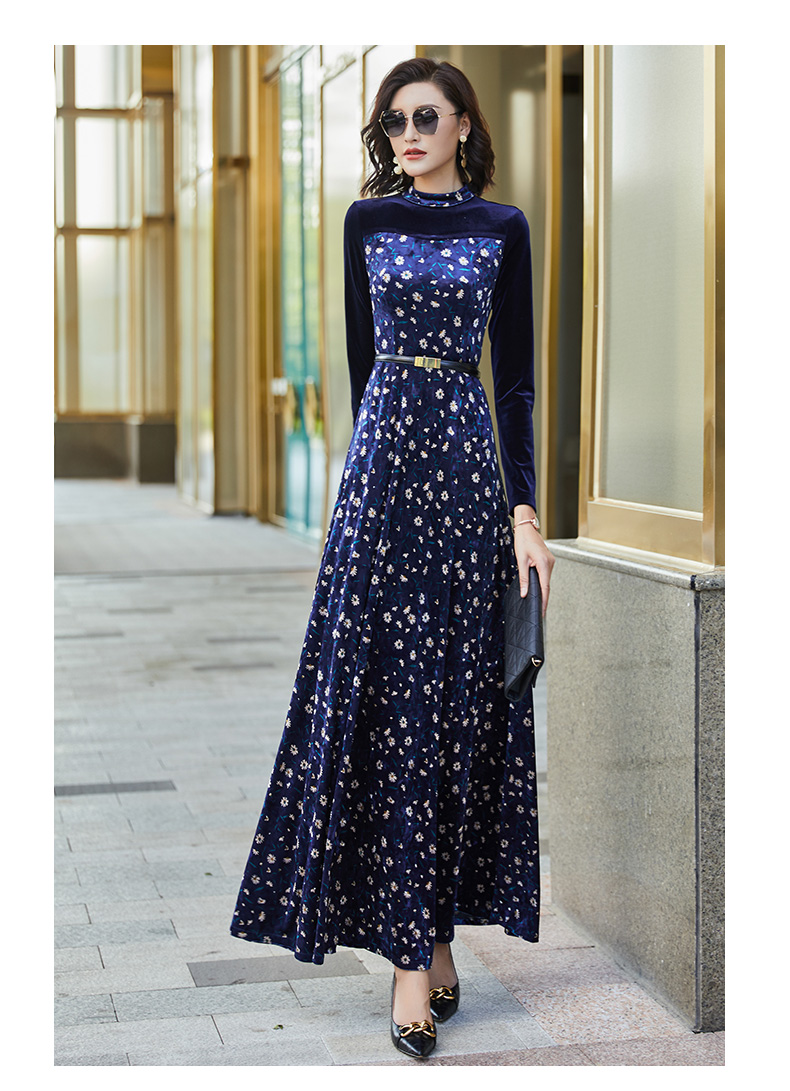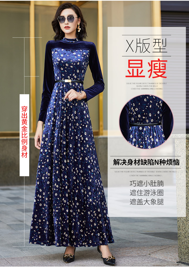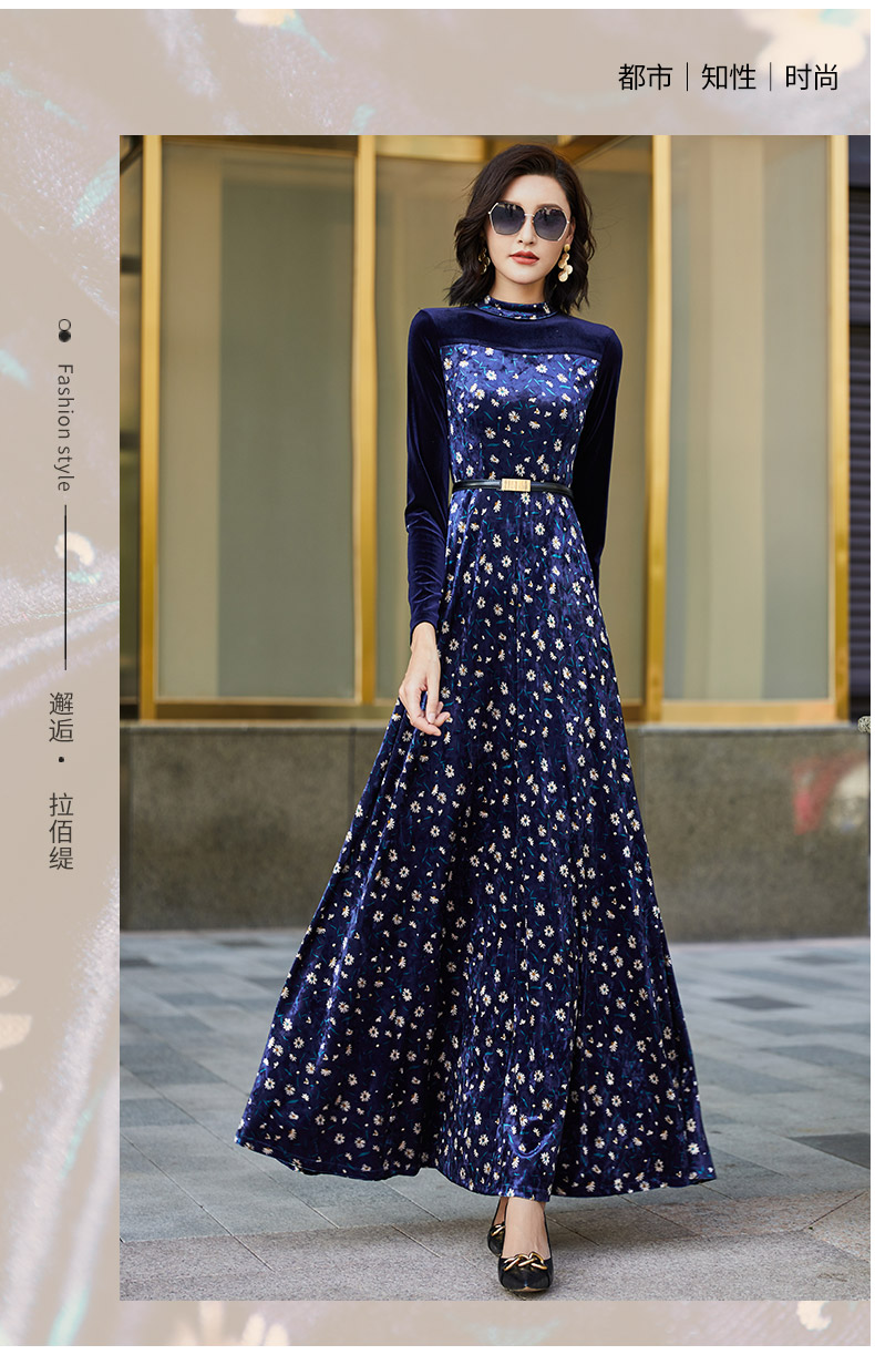 假兩件碎花連衣裙女2023春秋新款藏藍拼接修身溫柔足踝長裙子263