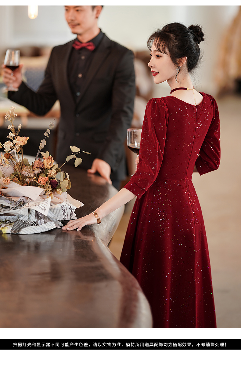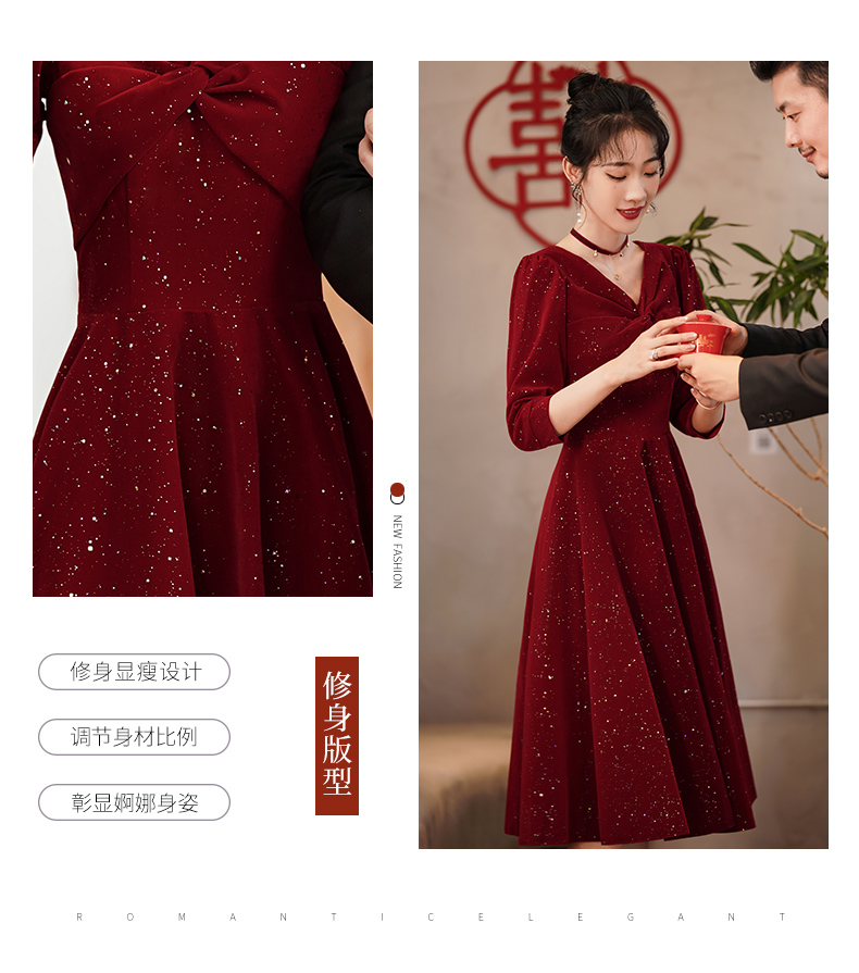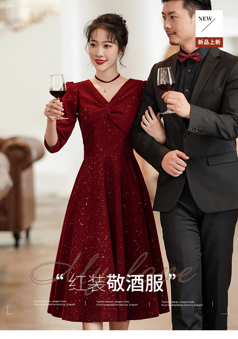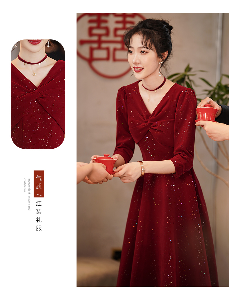新娘酒紅色平時可穿長袖絲絨敬酒服