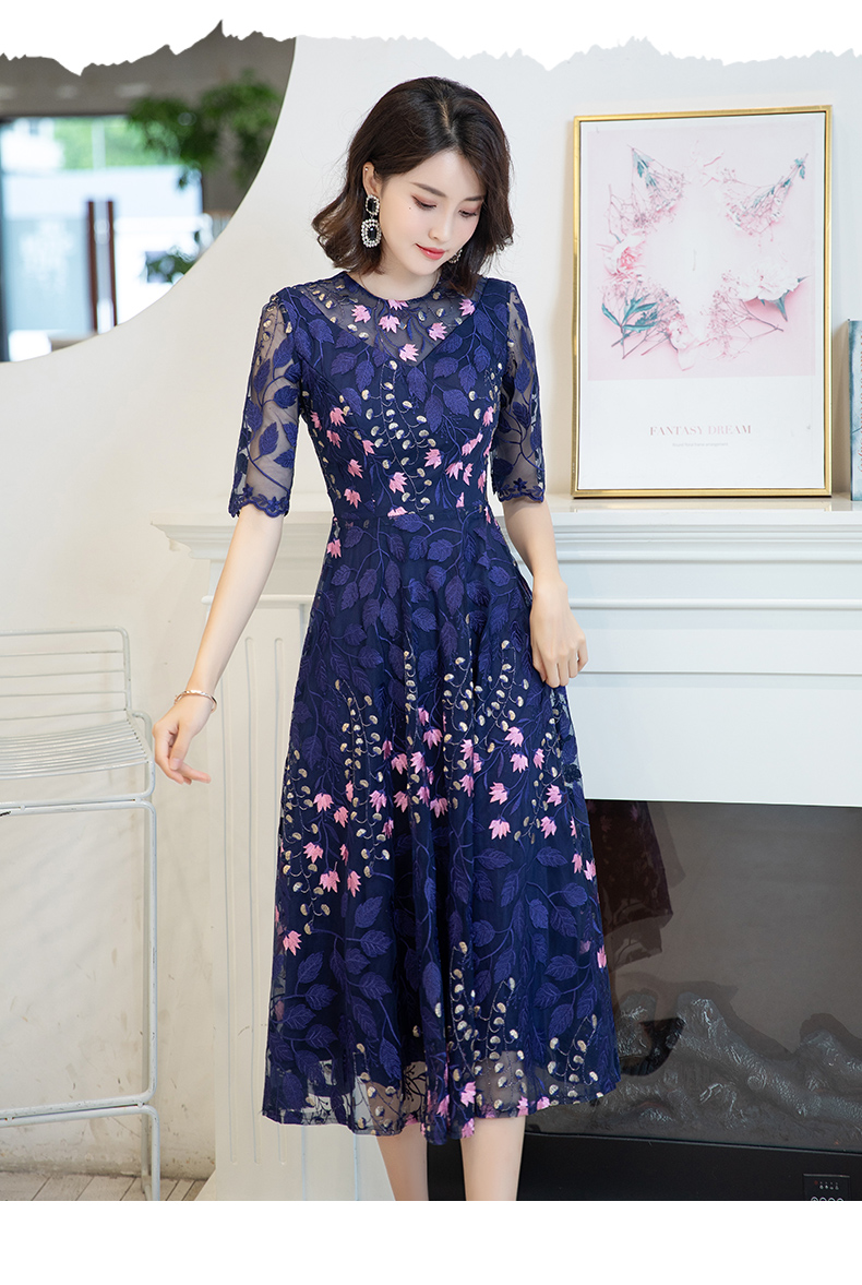 藍色蕾絲媽媽裝參加婚宴晚禮服女輕奢小眾高端平時可穿氣質主持裙