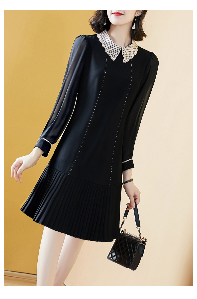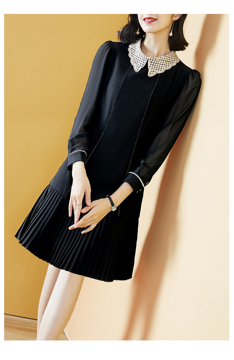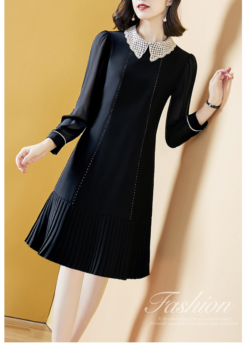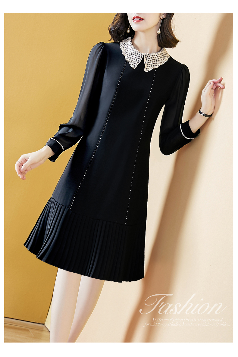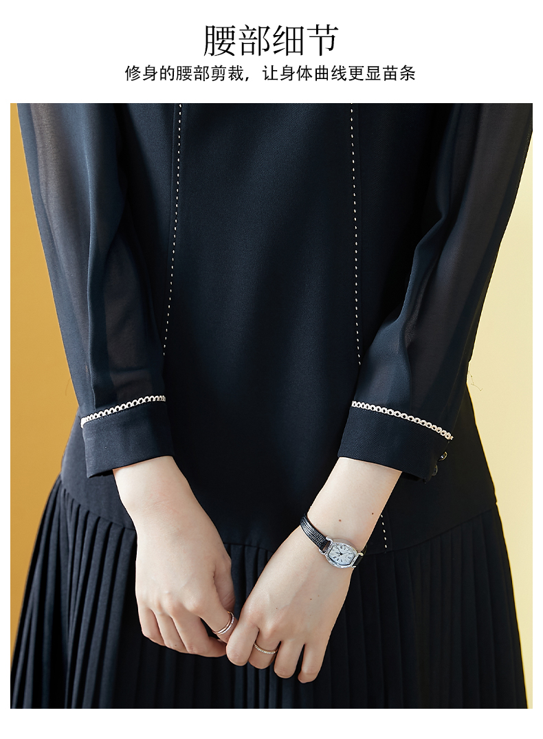 2023年春季新款連衣裙休閑黑色高貴優雅氣質女遮肚中袖春秋百褶裙