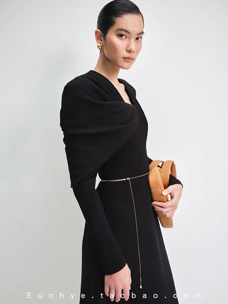 品牌授權 越南小眾CHATS 2021冬季新品不規則肩袖設計顯瘦連衣裙