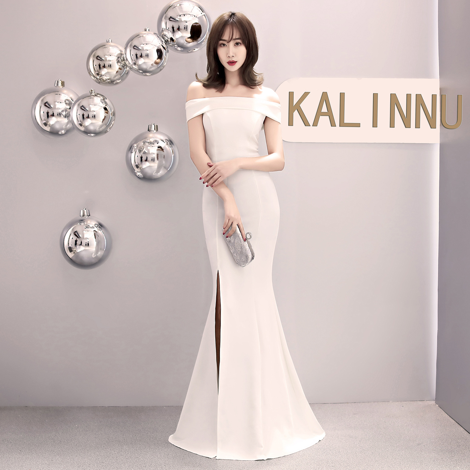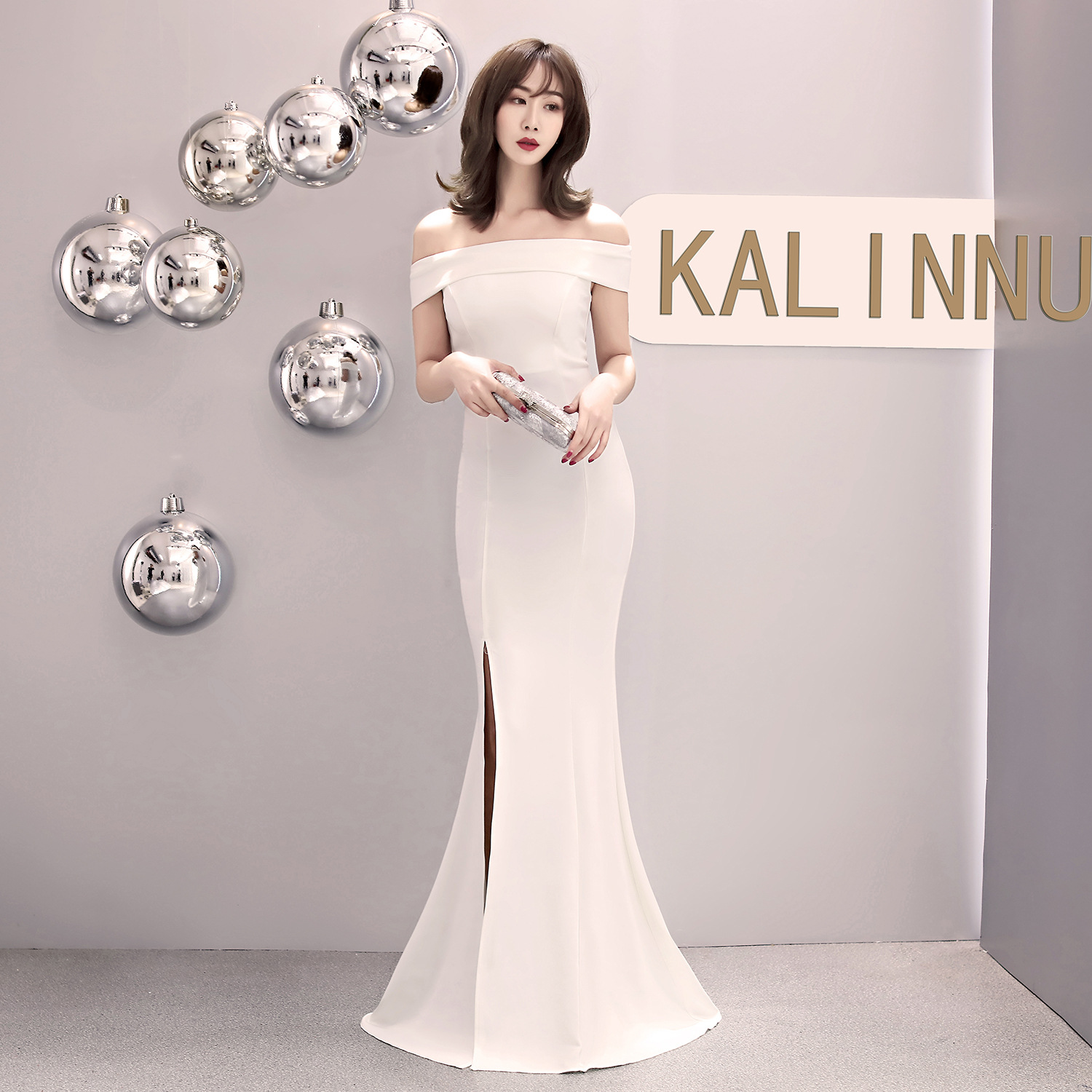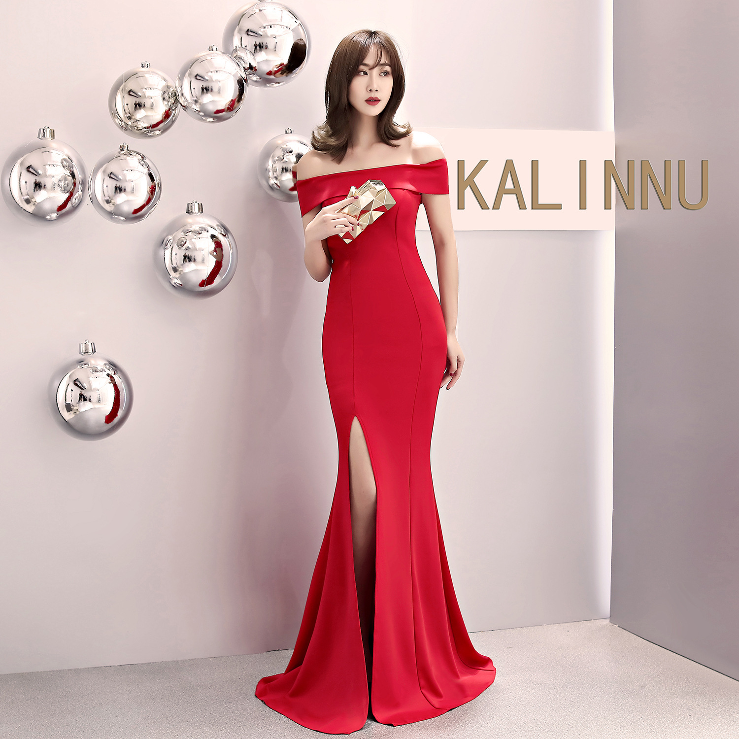 法式高端輕奢小眾一字肩露肩魚尾連衣裙女氣質優雅高貴輕奢晚禮服