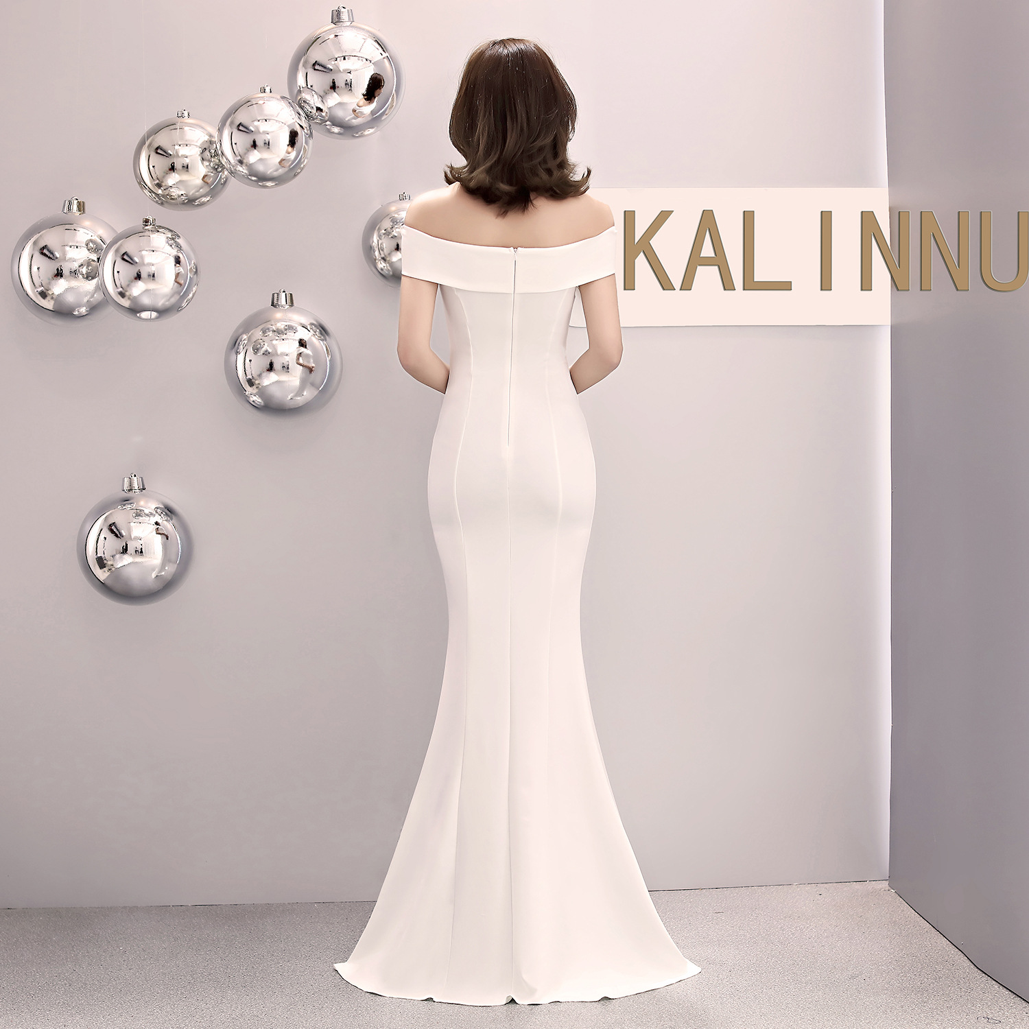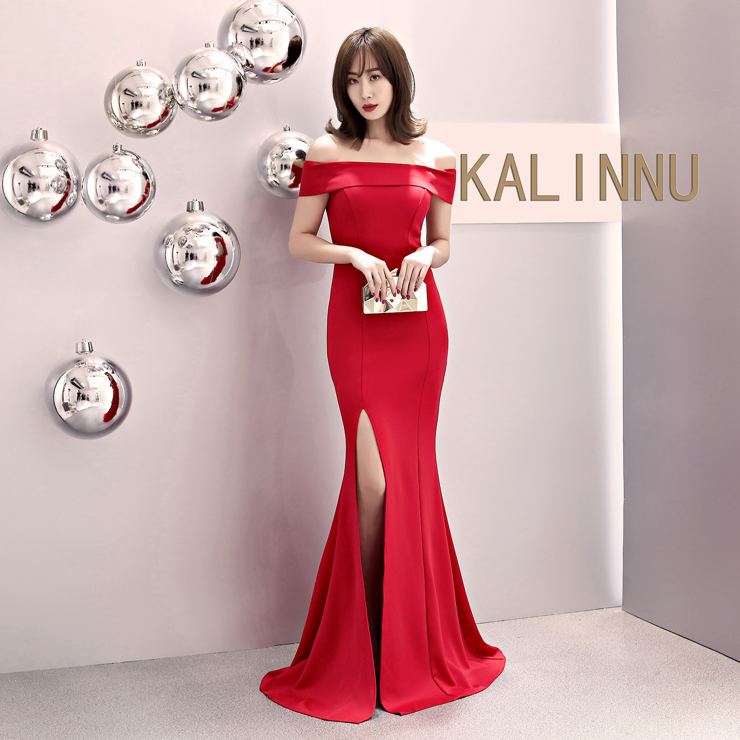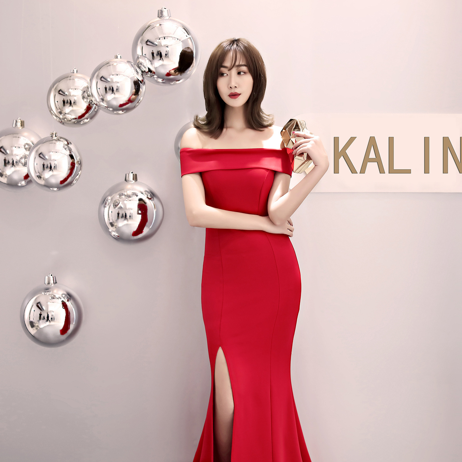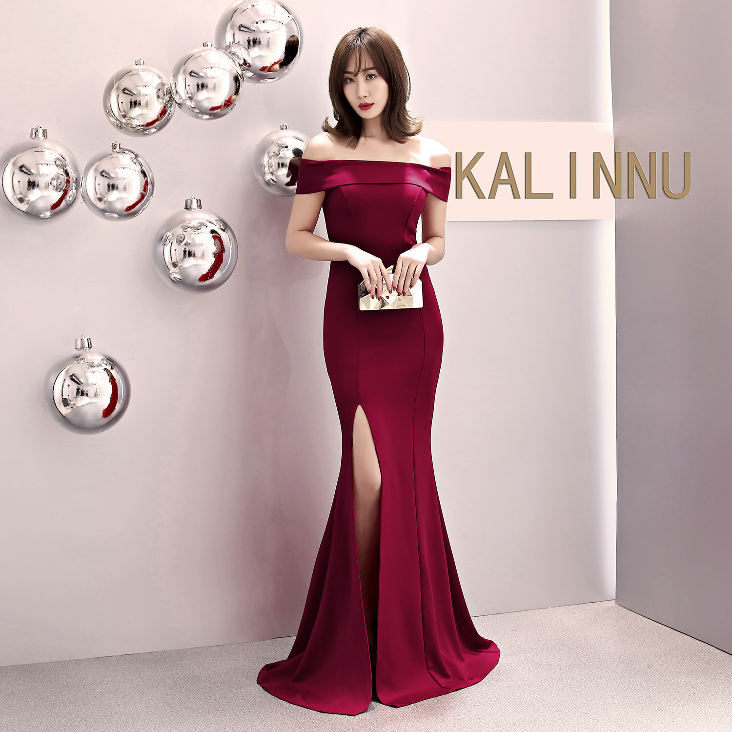 法式高端輕奢小眾一字肩露肩魚尾連衣裙女氣質優雅高貴輕奢晚禮服