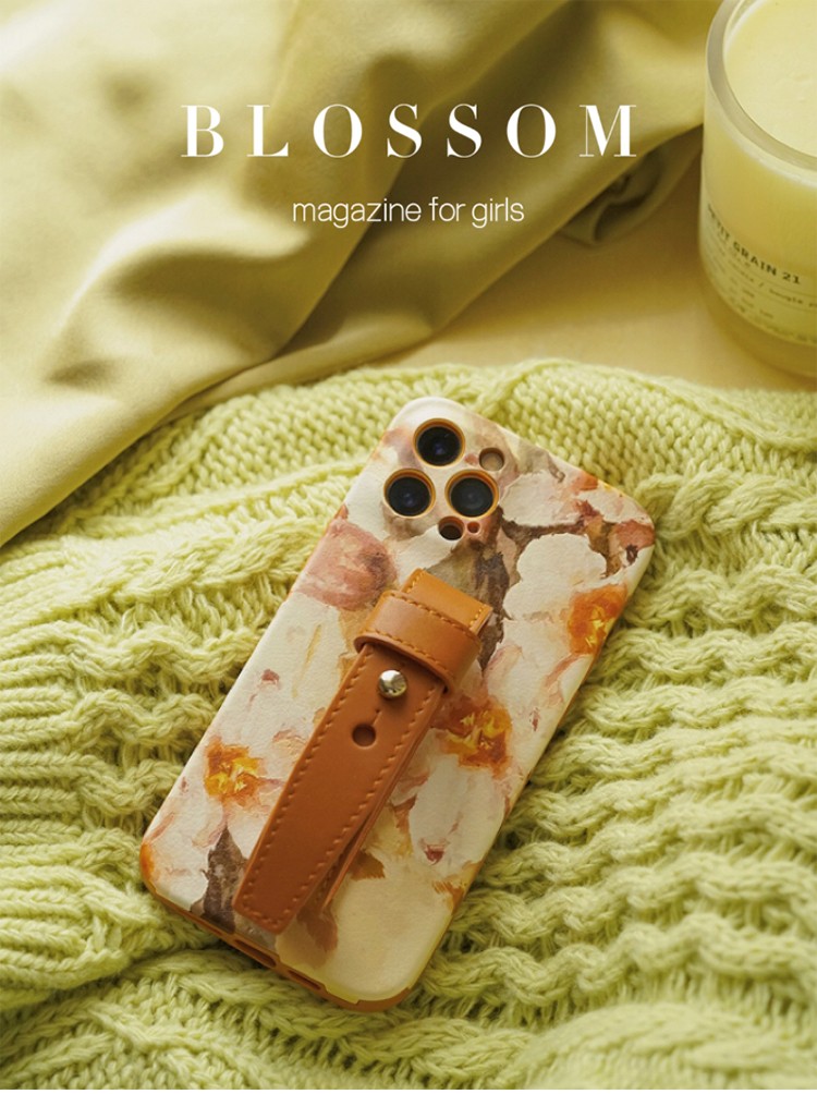 秋冬梨花油畫豆豆釘腕帶防摔手機殼牛皮手環原創適用于蘋果13pro