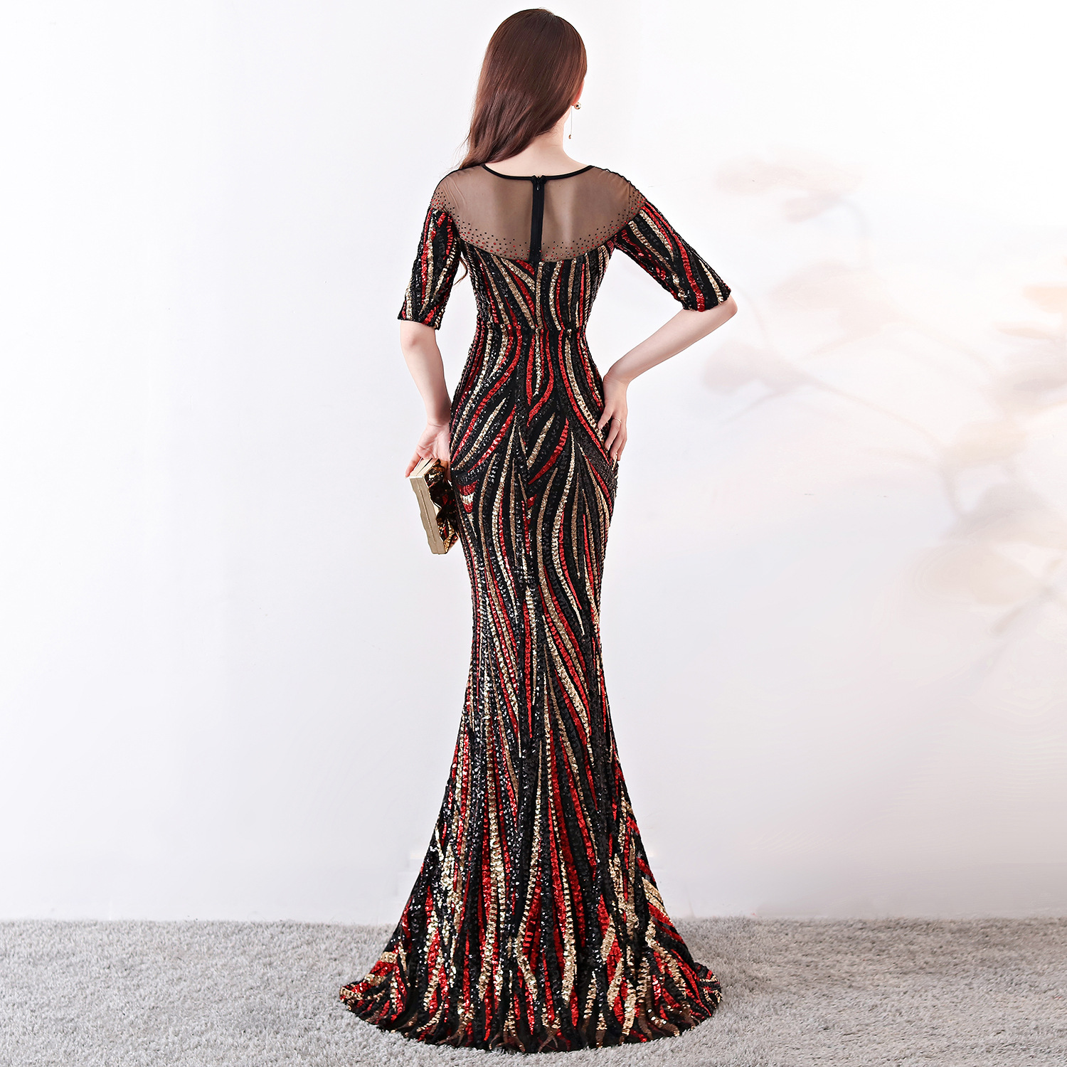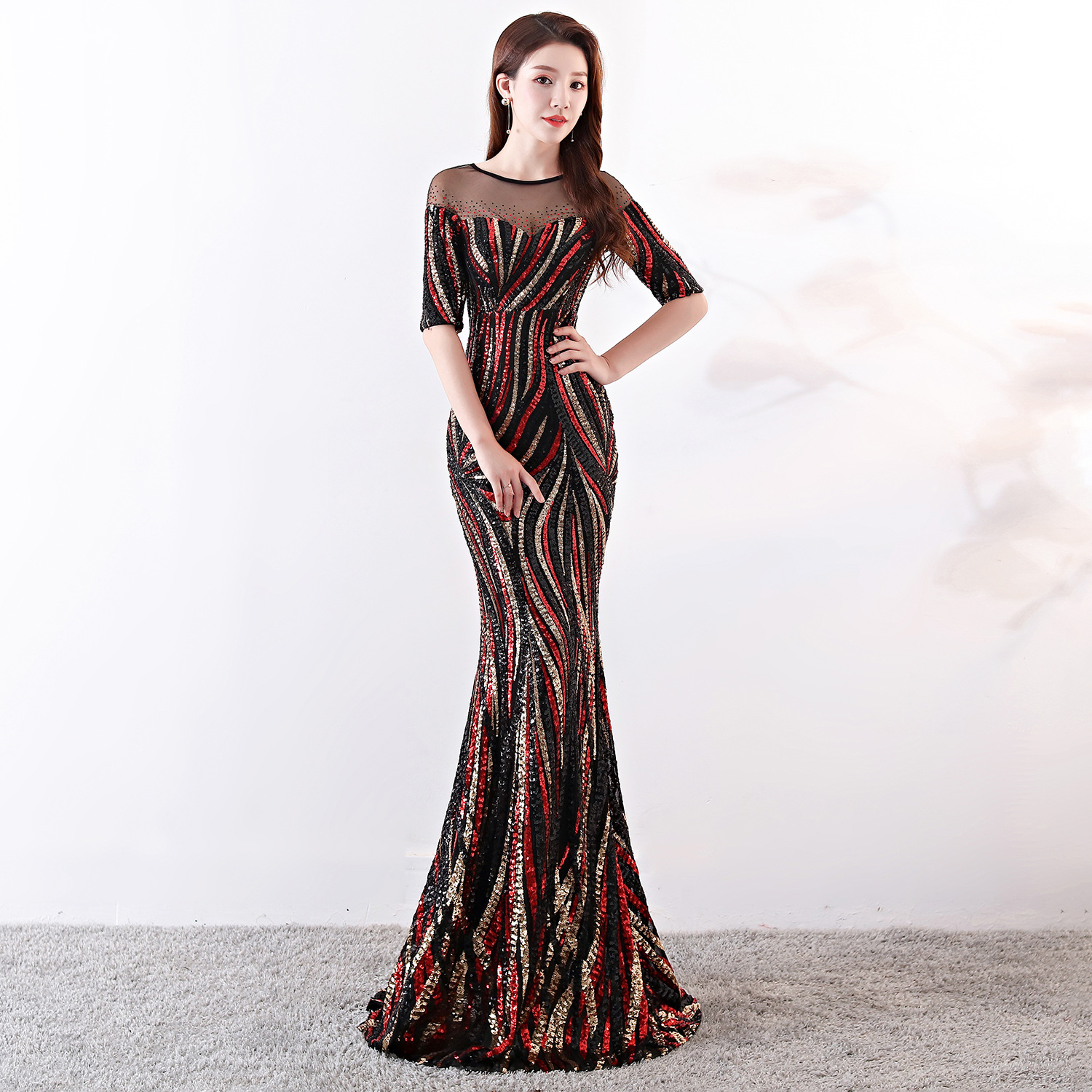 2023年秋季格子珠片魚尾宴會長裙