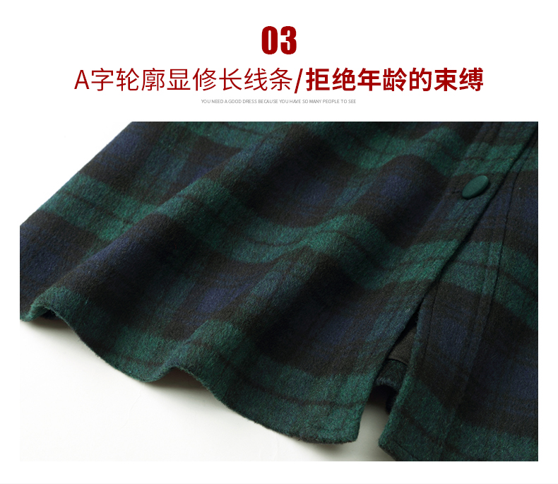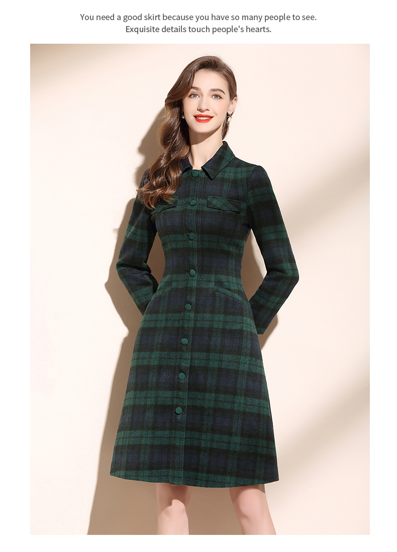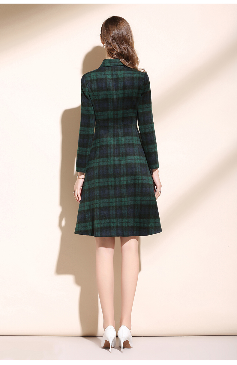 冬裝2023年新款女翻領高端氣質長袖收腰綠色格子毛呢連衣裙秋冬款