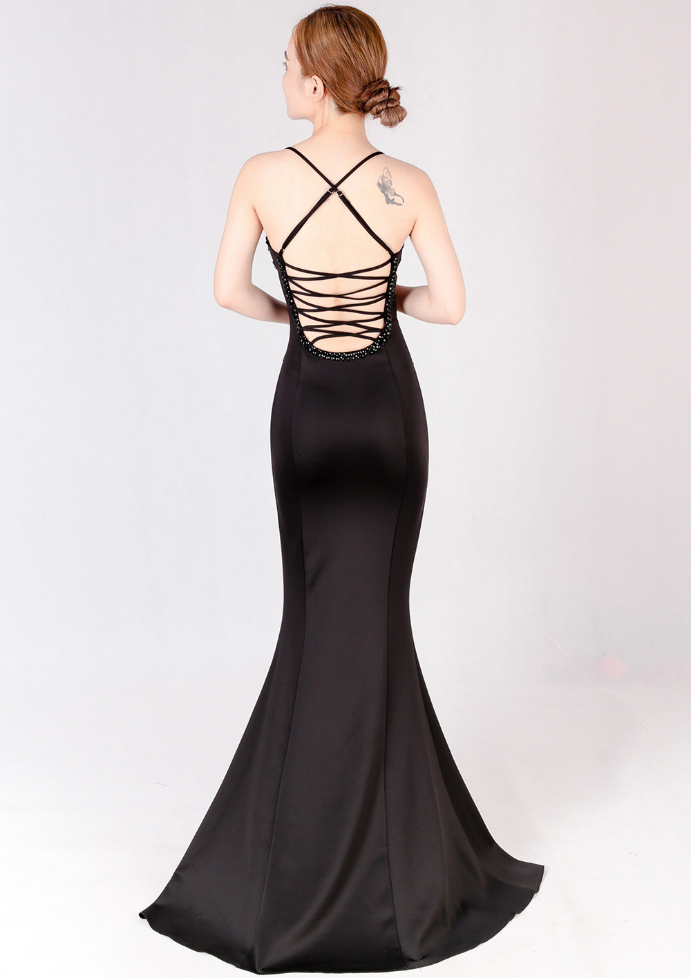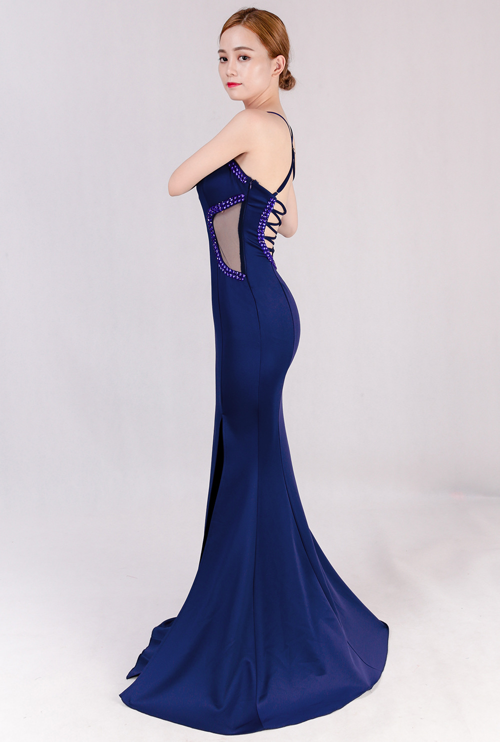 新款緞布訂珠長款開叉名媛晚宴長裙