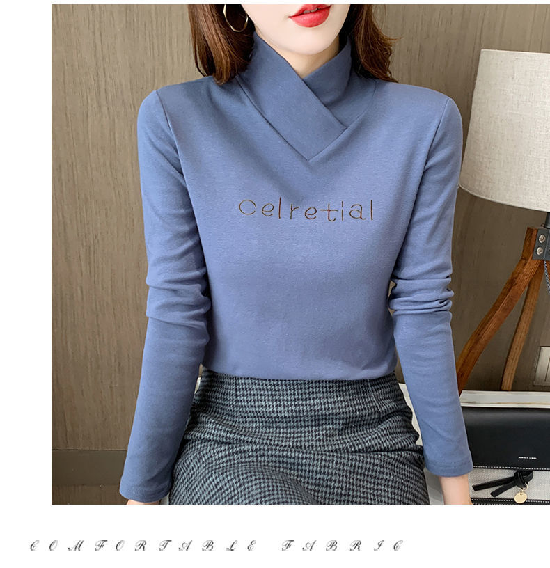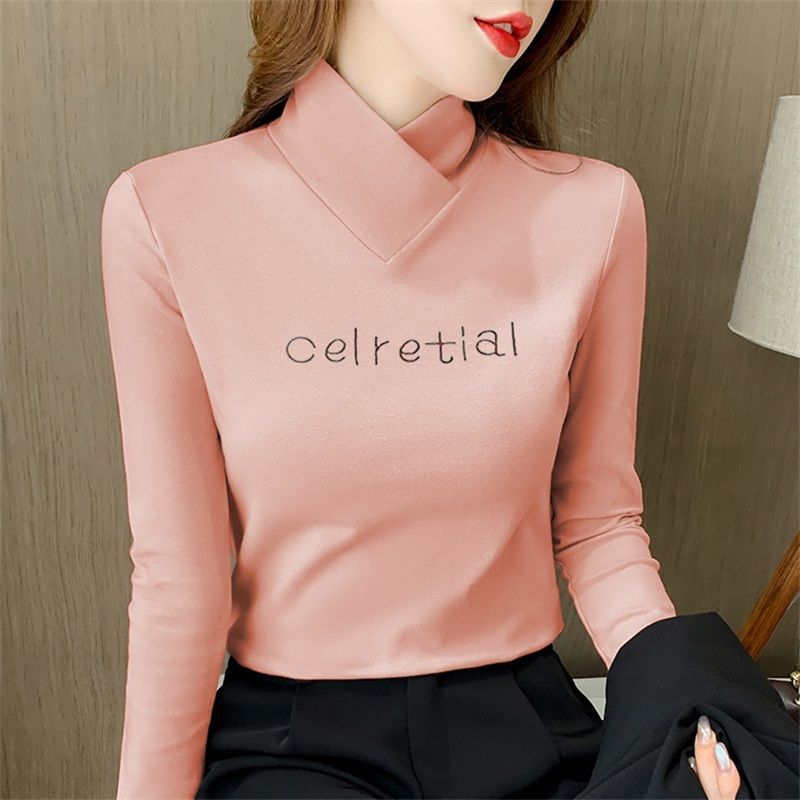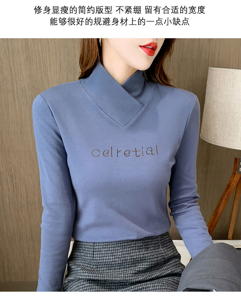 單/兩件 德絨長袖打底衫女秋冬百搭2023新款交叉V領繡花t恤上衣女