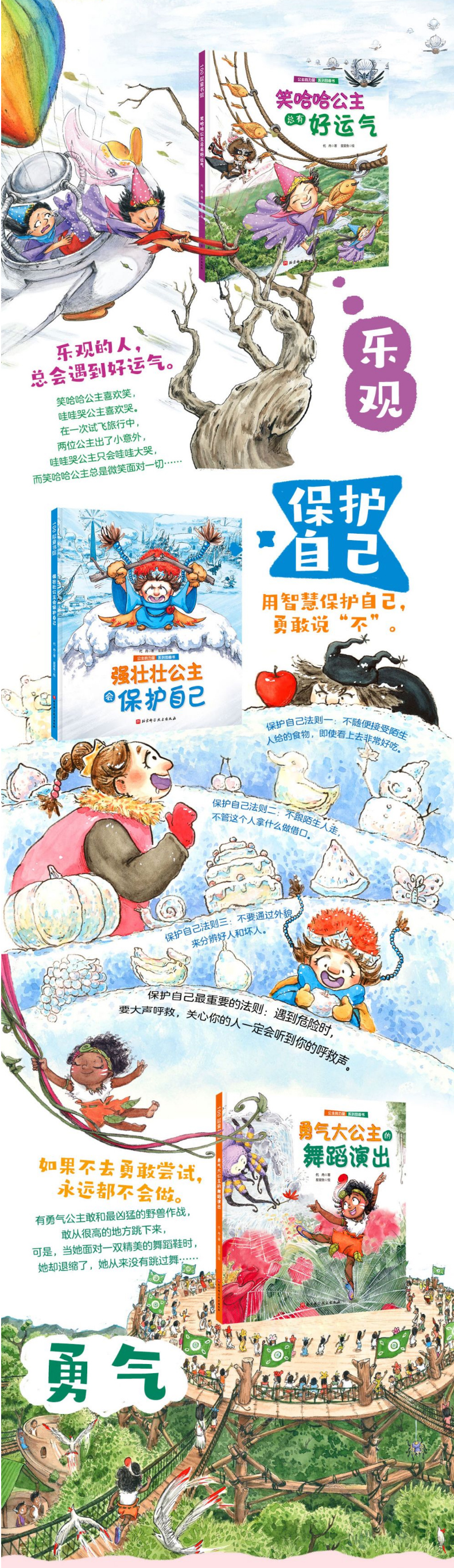“公主的力量”系列包含6冊書,《有信心公主的大發明》《勇氣大公主的舞蹈演出》《優雅公主想放一個屁》《笑哈哈公主總有好運氣》《強壯壯公主會保護自己》《獨立酷公主拯救閃電國》。 來自機械國、金角國、海貝國、圓木國、閃電國和風凍凍國的六位公主,她們是擁有自信、樂觀、優雅、勇敢、獨立、會保護自己性格的全新公主,她們不像白雪公主那樣柔弱,也不像睡美人那樣等待王子拯救,她們通過自己解決著各種各樣的難題。 有信心公主相信自己可以做大發明,優雅公主教會你做優雅小孩,獨立酷公主一切靠自己,笑哈哈公主永遠樂觀,強壯壯公主可以保護自己,勇氣大公主可以勇敢的嘗試一切。六本故事,六位公主的力量,讓女孩學會做自己,讓男孩懂得尊重女孩。