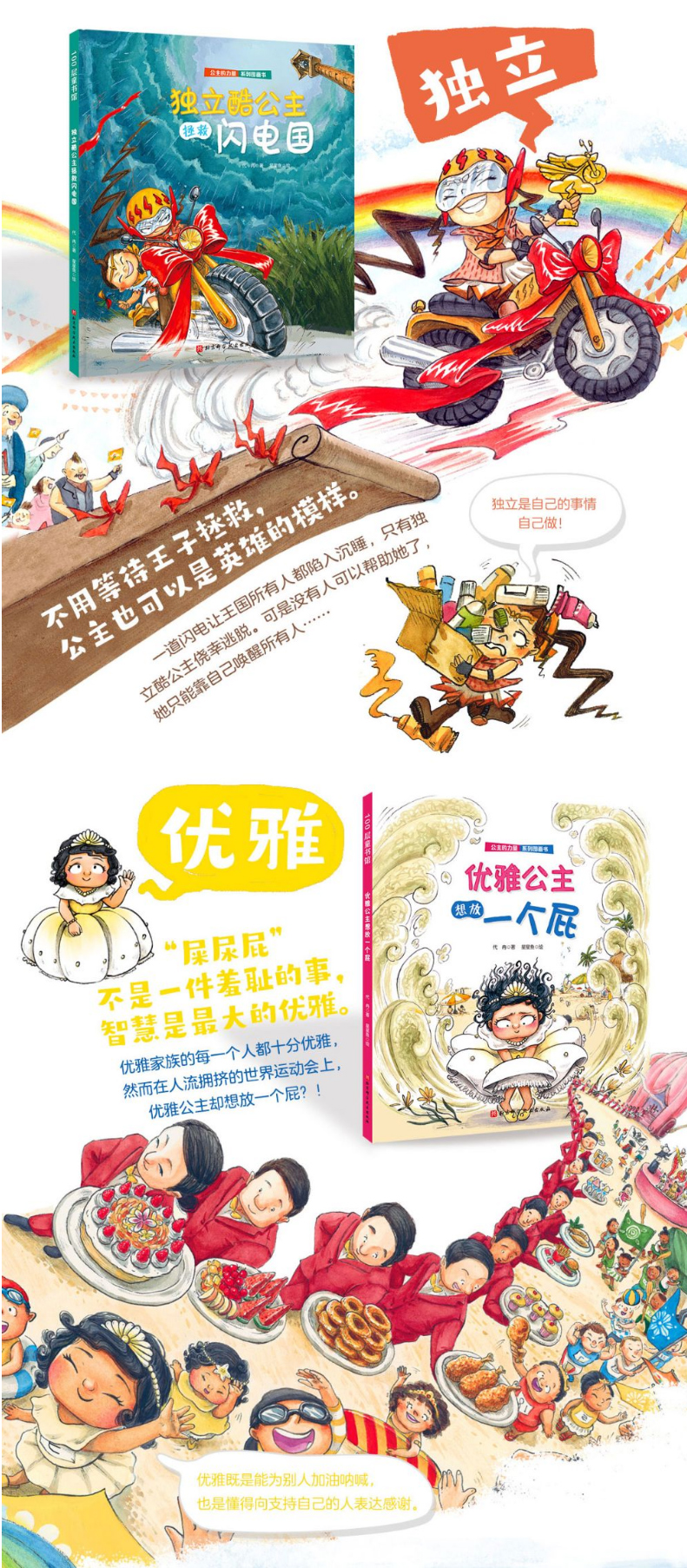 “公主的力量”系列包含6冊書,《有信心公主的大發明》《勇氣大公主的舞蹈演出》《優雅公主想放一個屁》《笑哈哈公主總有好運氣》《強壯壯公主會保護自己》《獨立酷公主拯救閃電國》。