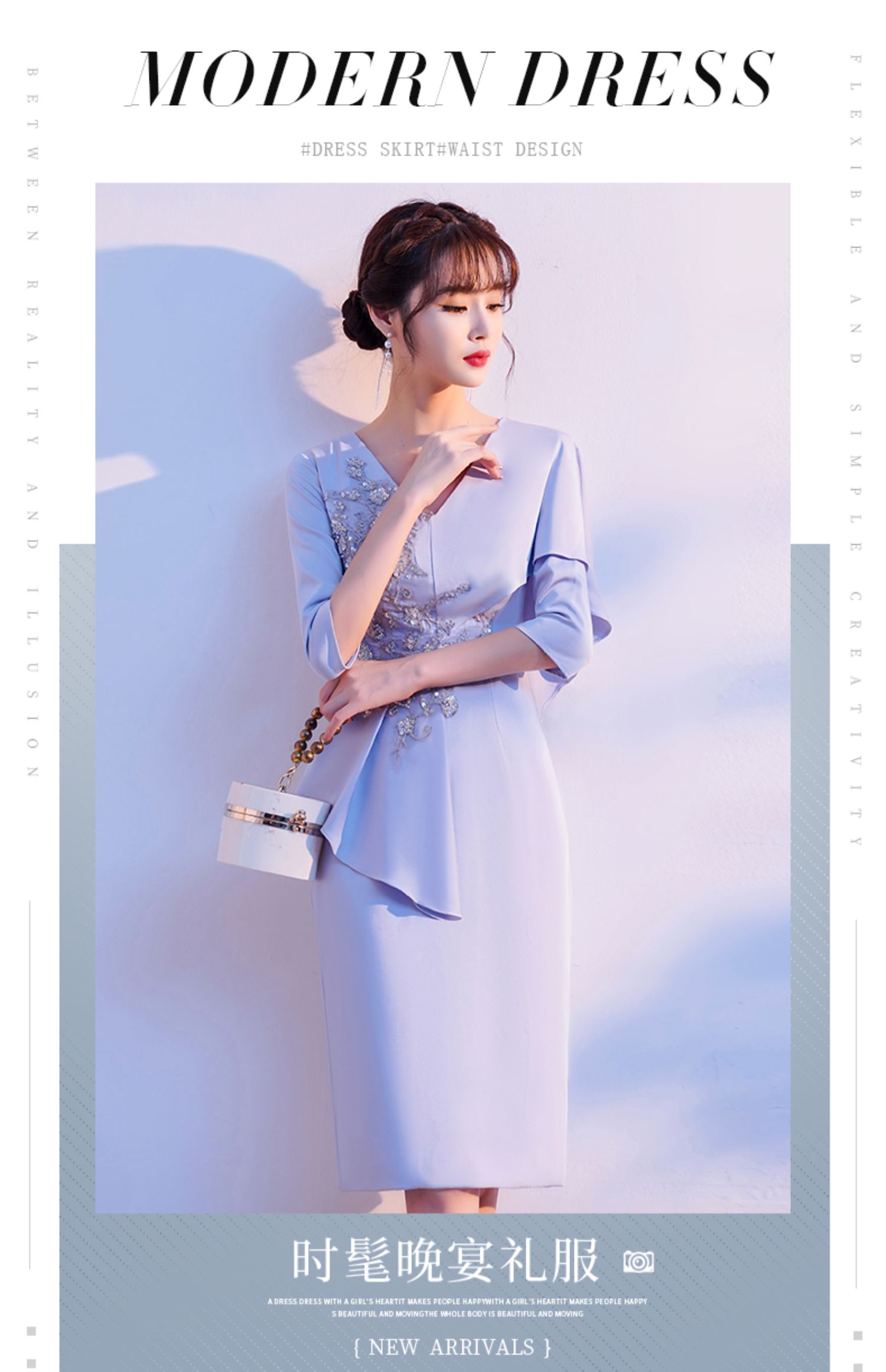 藍色晚禮服女高級感氣質宴會高端媽媽婚宴裝年會主持人連衣裙長袖