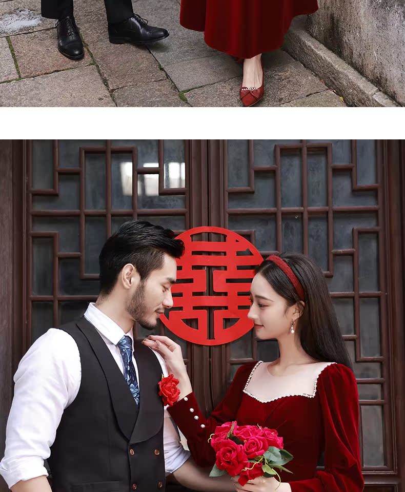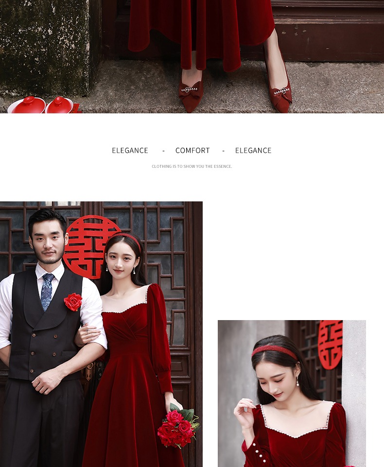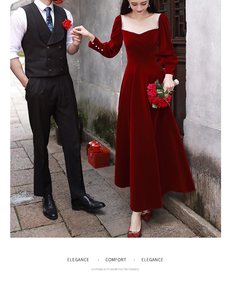 紅色絲絨禮服冬季敬酒服新娘長袖加厚驚艷紅裙結婚訂婚回門連衣裙