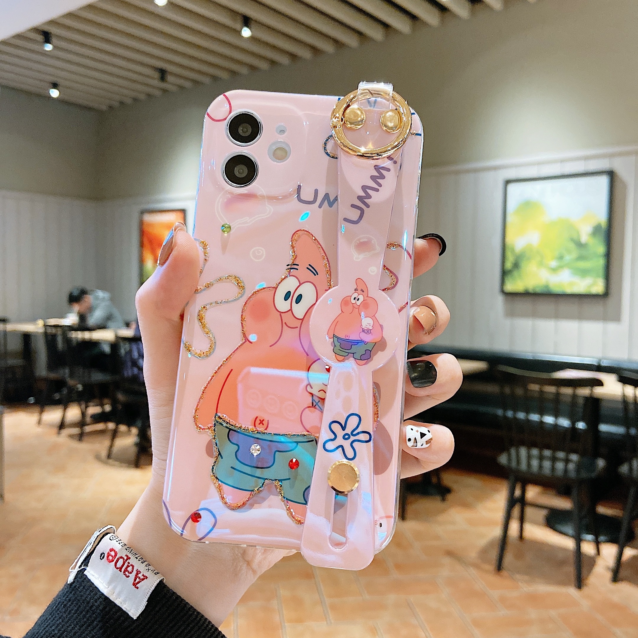 海綿寶寶派大星適用蘋果14手機殼卡通可愛12pro帶腕帶掛繩iPhone11斜挎可背13promax鏡頭全包XR防摔xs軟硅膠