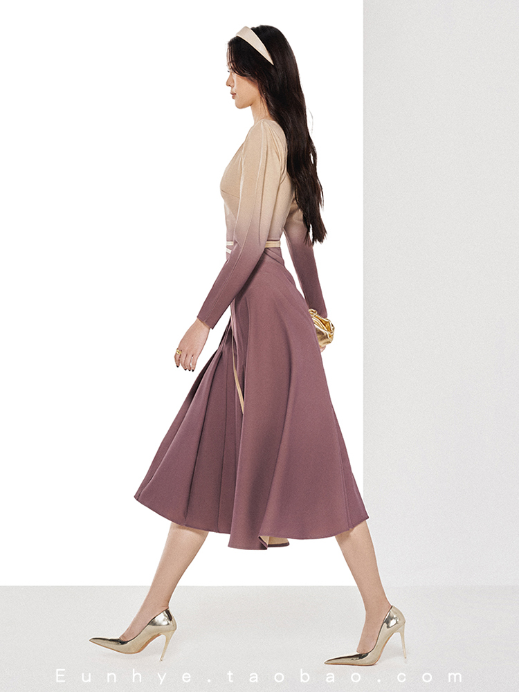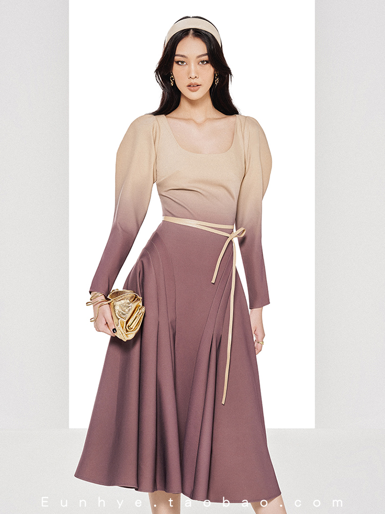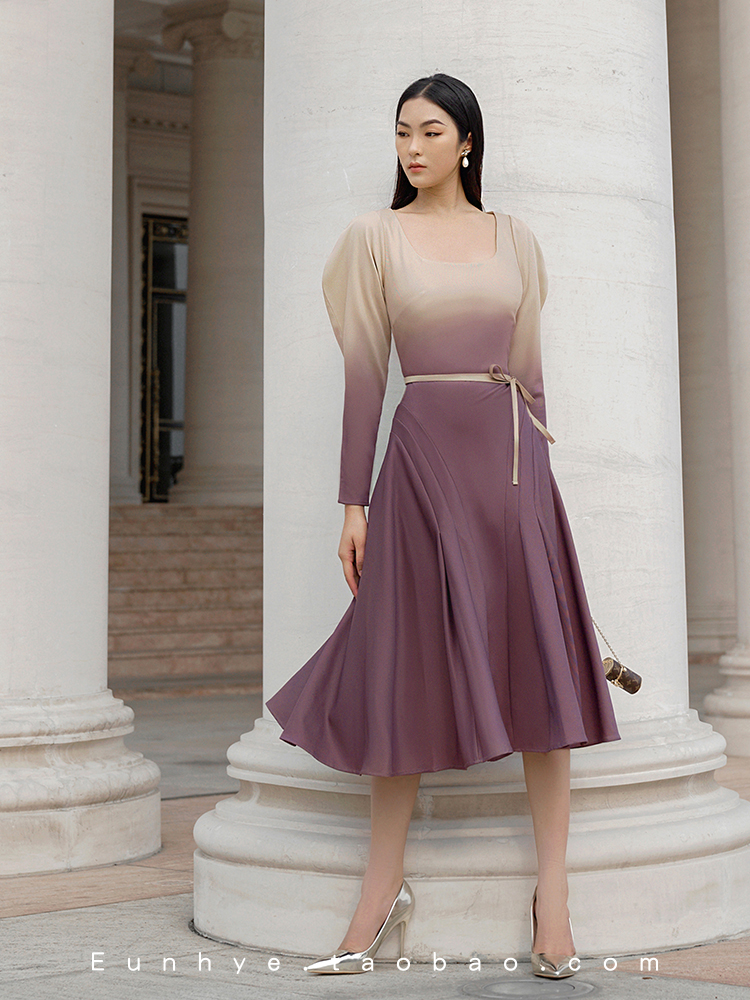 越南小眾MUSTHAVE 2021冬季新款紫色漸變氣質高腰韓版長袖連衣裙
