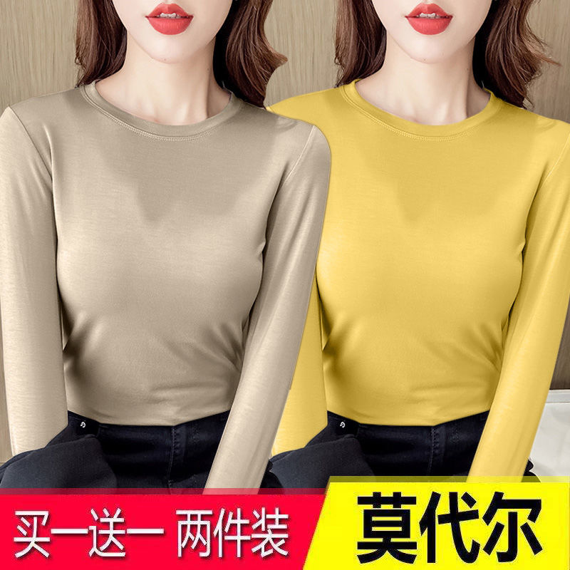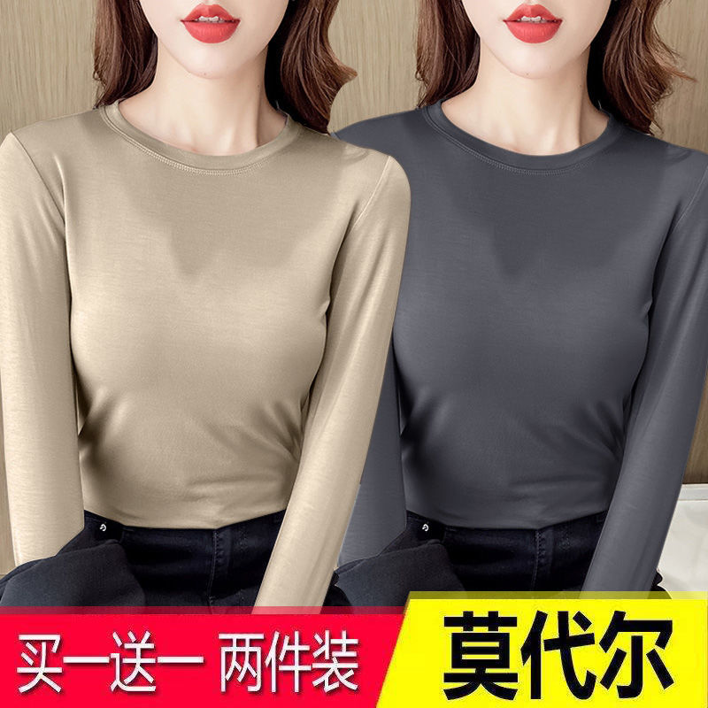 單/兩件裝莫代爾圓領打底衫春秋純色上衣修身長袖T恤女內搭體恤衫