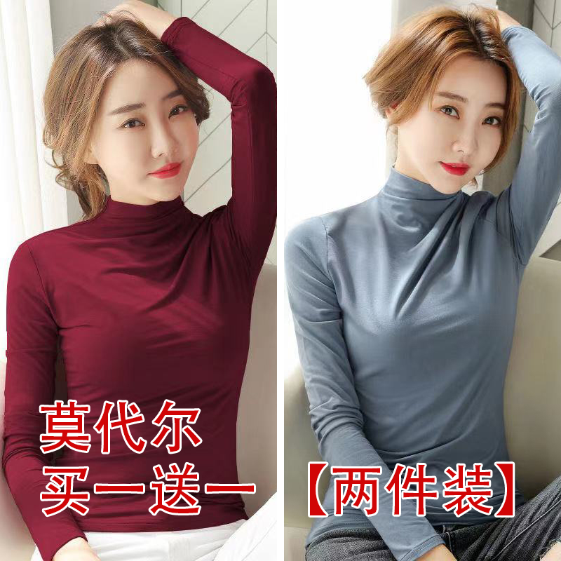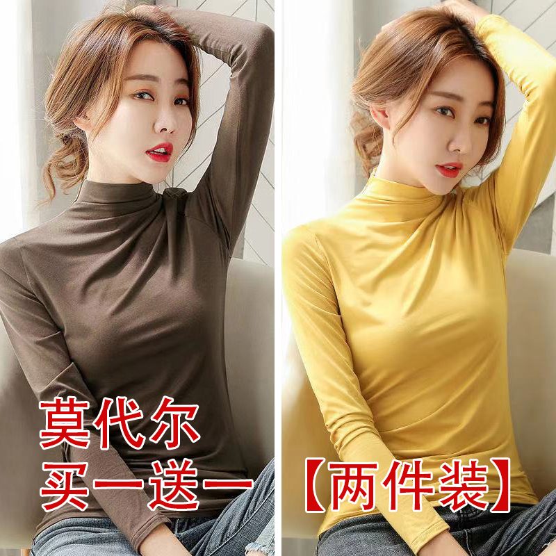 單/兩件裝 莫代爾半高領打底衫女秋季新款螺紋內搭長袖T恤女上衣
