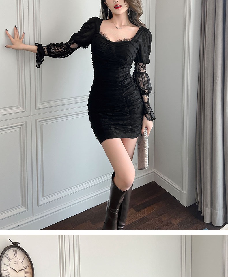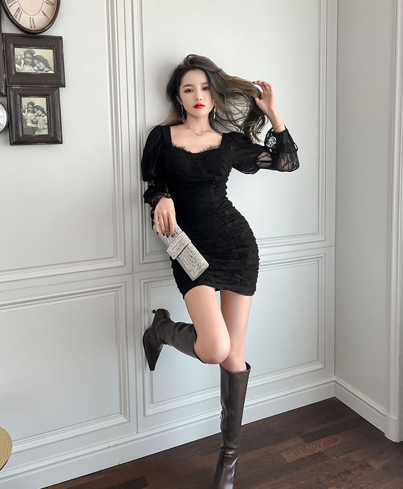 長袖ins風顯瘦炸街女過膝連衣裙