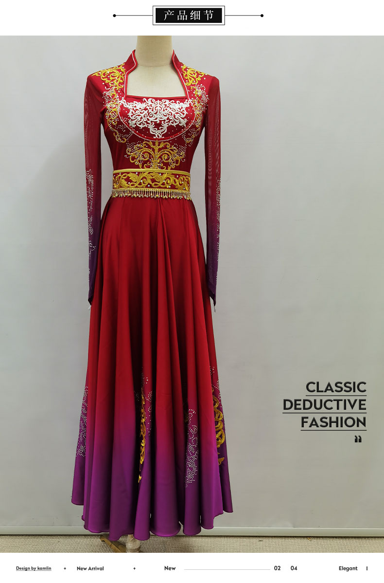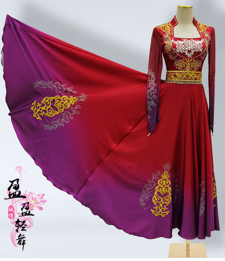 新款新疆舞蹈演出服女少數民族維吾爾族漸變大裙擺藝考表演服定制