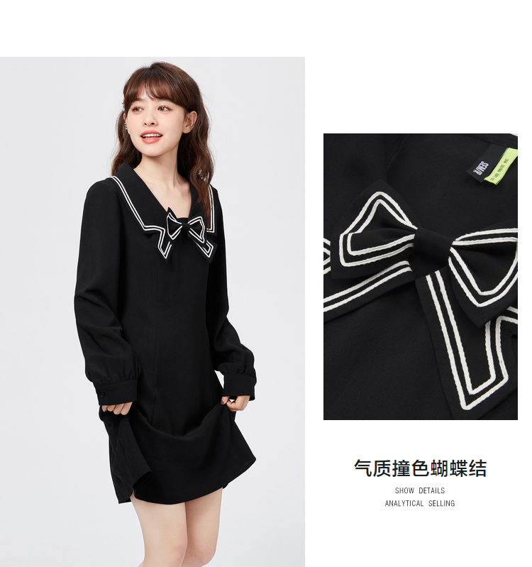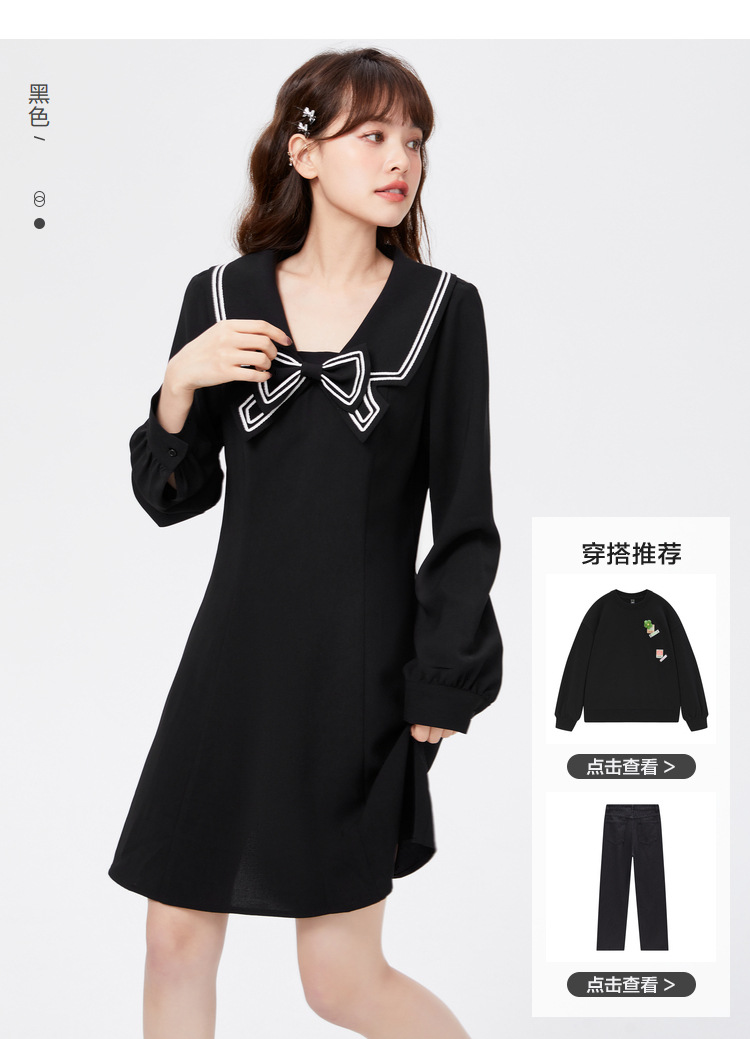 森馬連衣裙女撞色學院風蝴蝶結黑白2023秋新款顯瘦小黑裙韓版時尚