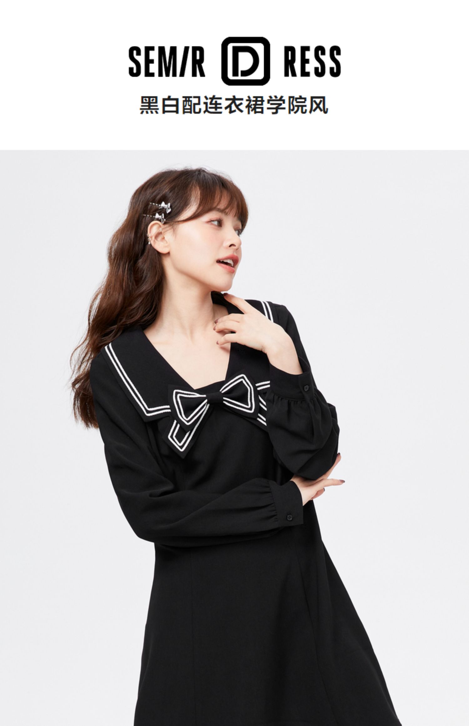 森馬連衣裙女撞色學院風蝴蝶結黑白2023春新款顯瘦小黑裙韓版時尚
