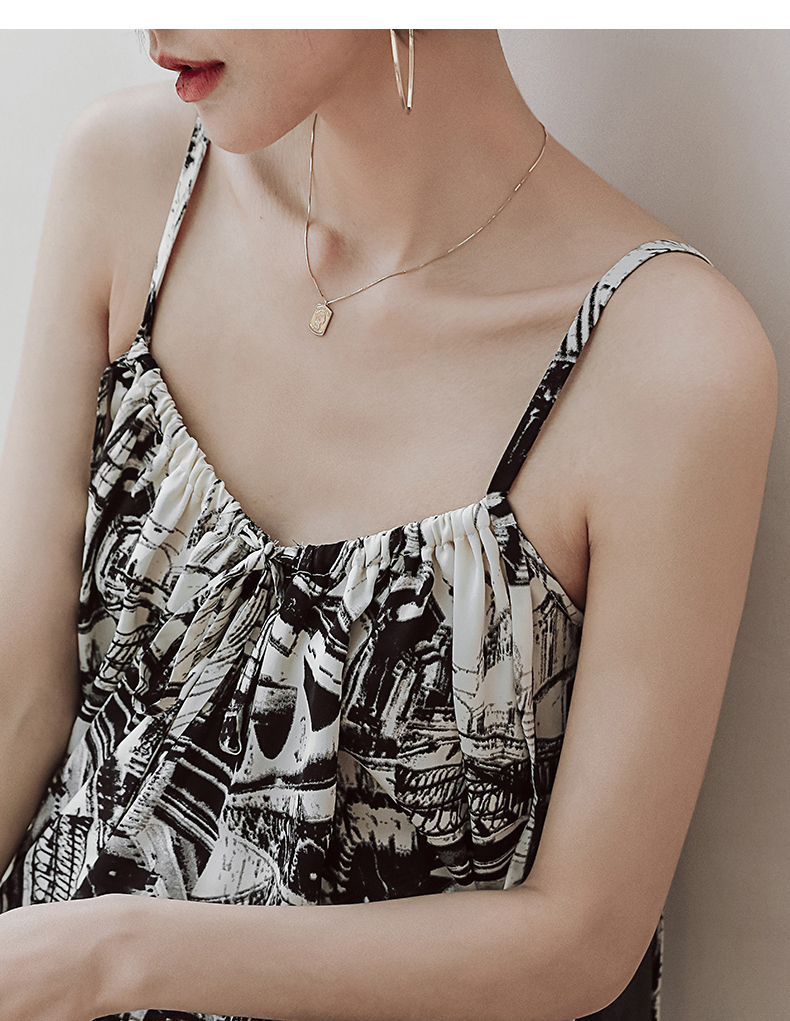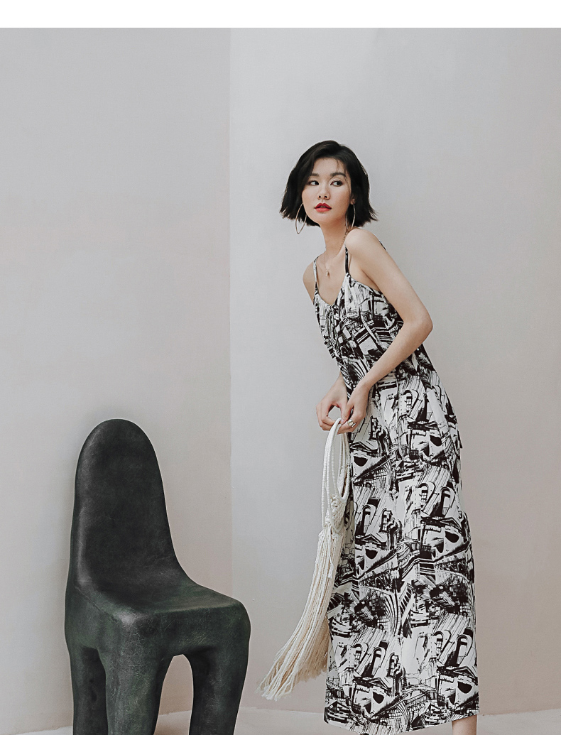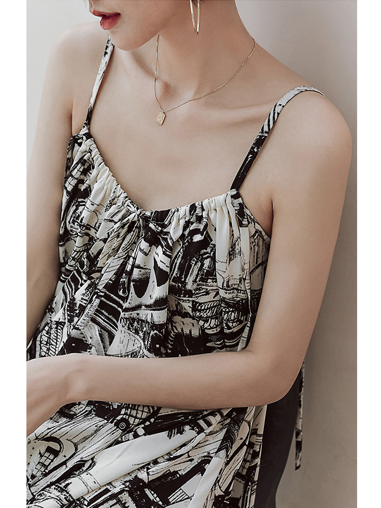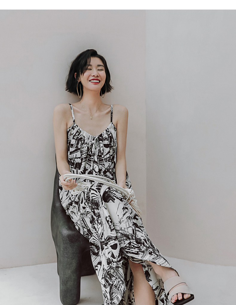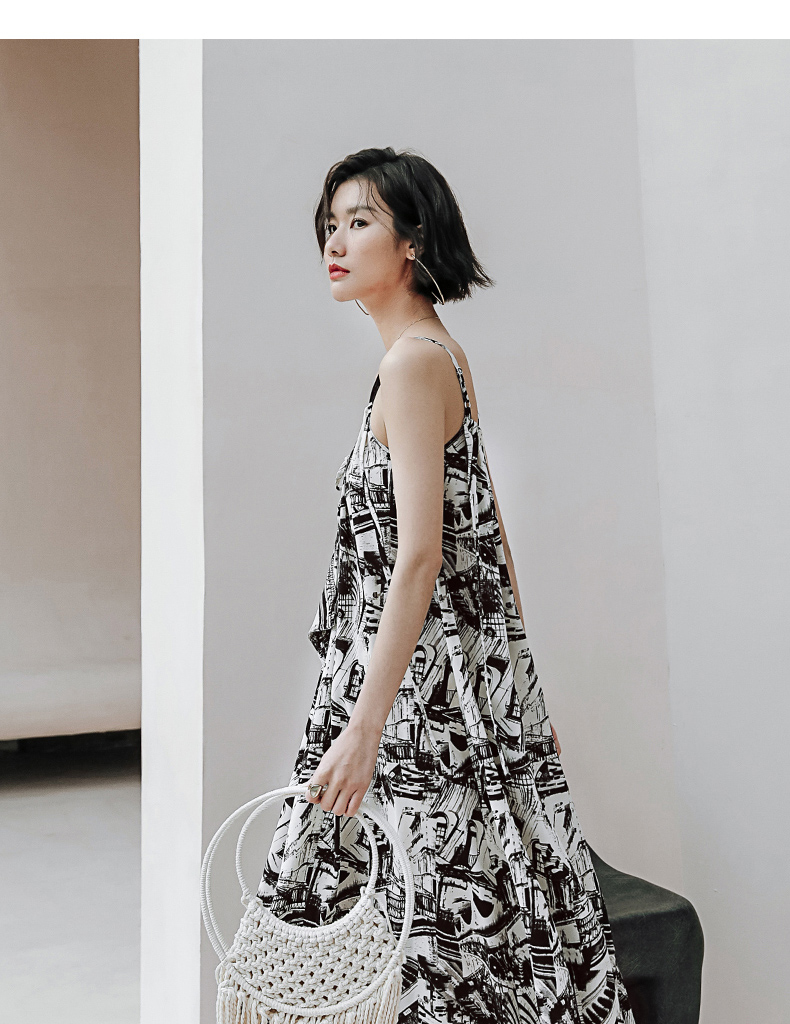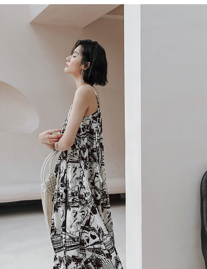 彌古復古水墨畫連衣裙高級感法式雪紡吊帶長裙女夏海邊度假沙灘裙