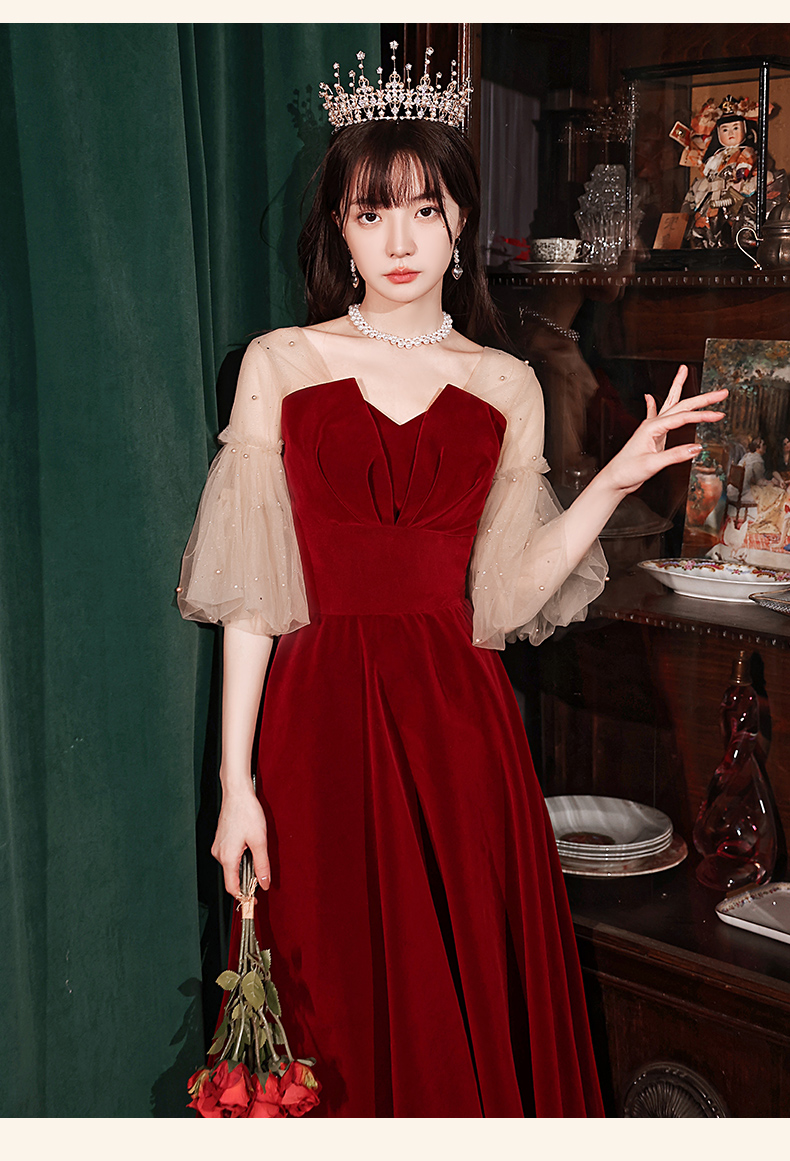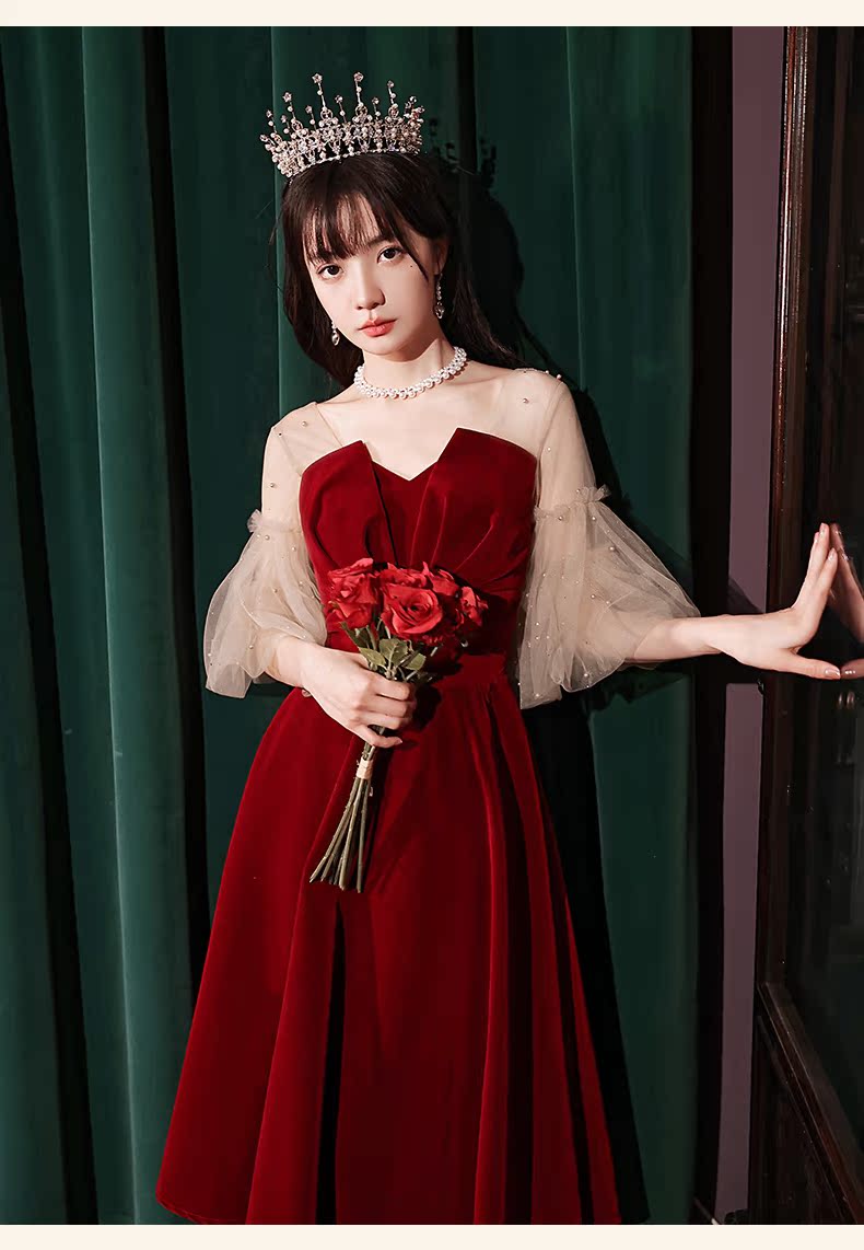 酒紅色小個子泡泡袖新娘秋季敬酒服訂婚禮服裙女平時可穿2022新款