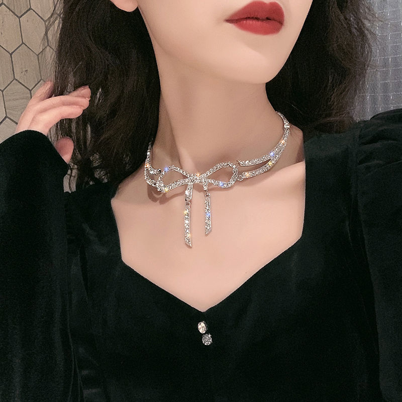 輕奢高級感超閃鑲鉆蝴蝶結項鏈名媛大氣短款設計感鎖骨鏈