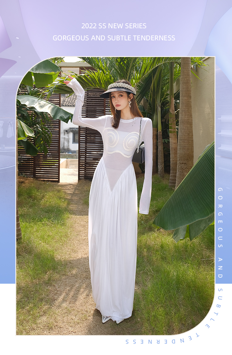 何穗同款WEARABLE EVENT時尚簡約白色圖騰印花堆量連衣裙春夏新品