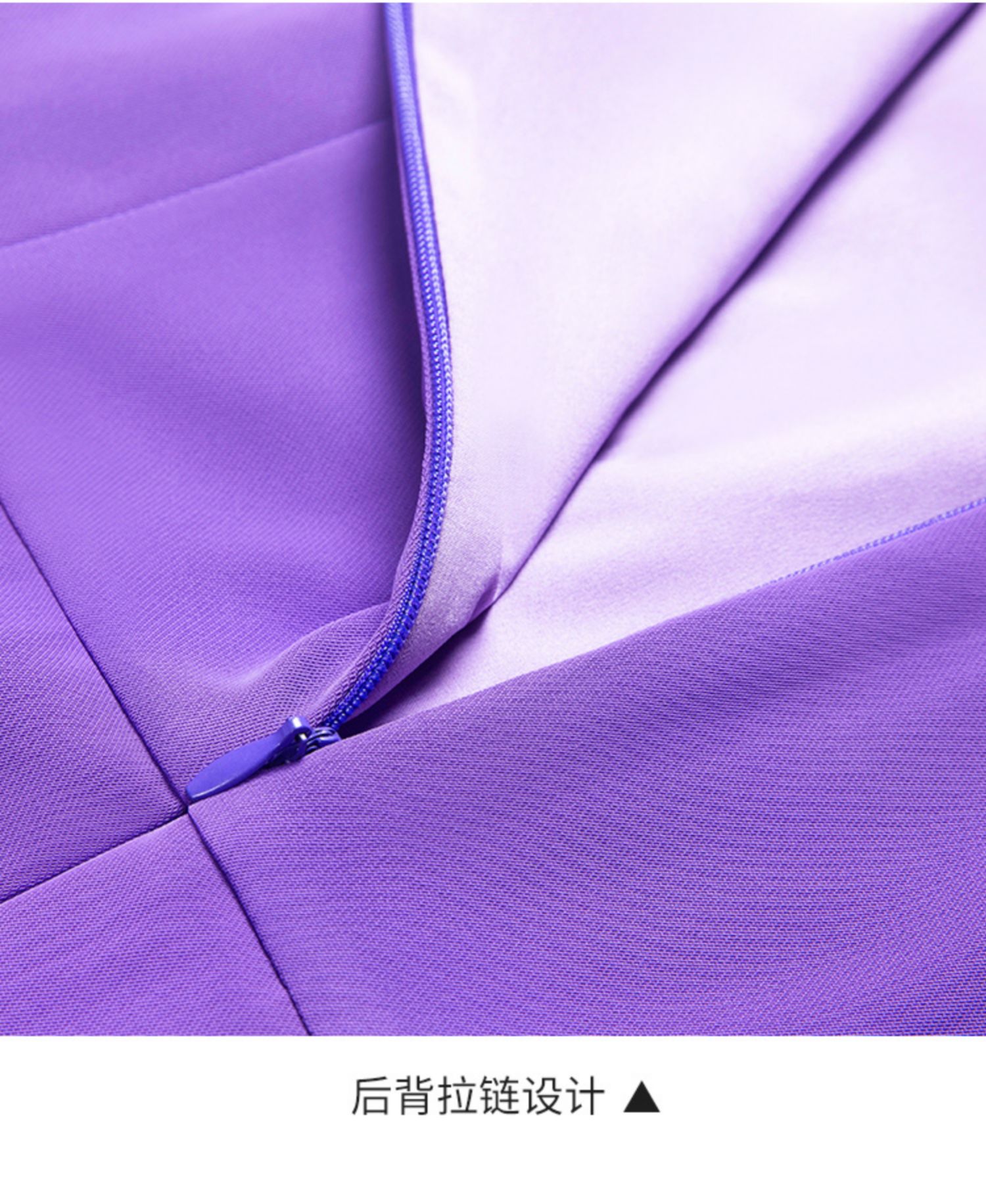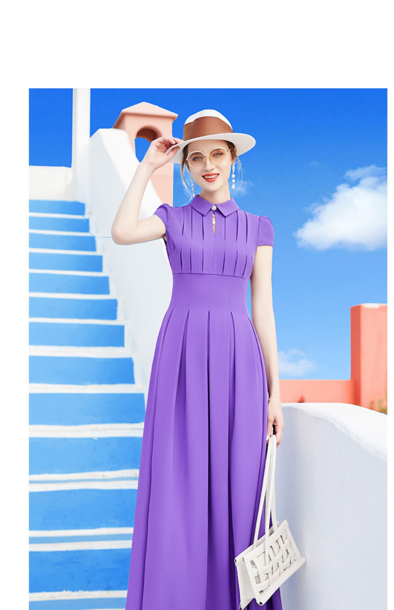 帝弗潤馳紫色翻領氣質百褶長款短袖連衣裙女2023年夏季收腰長裙