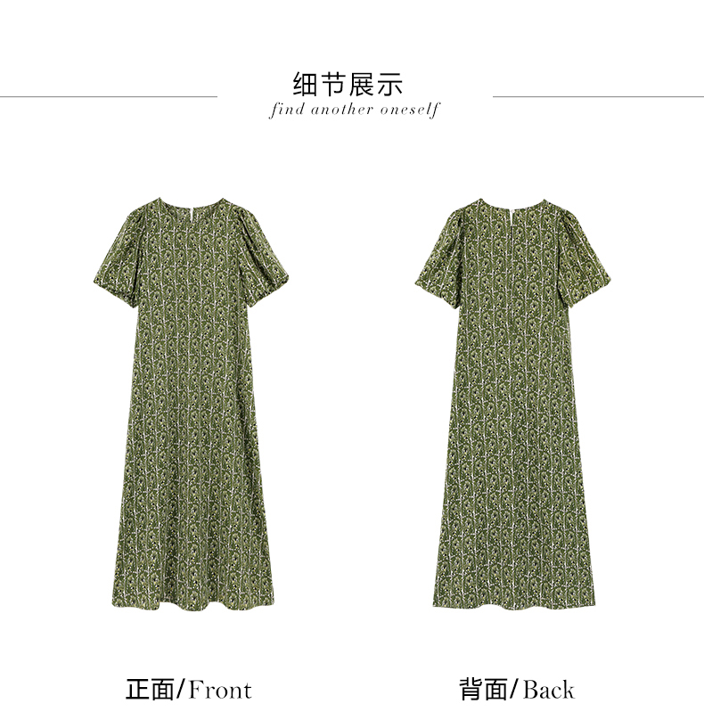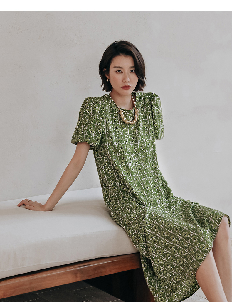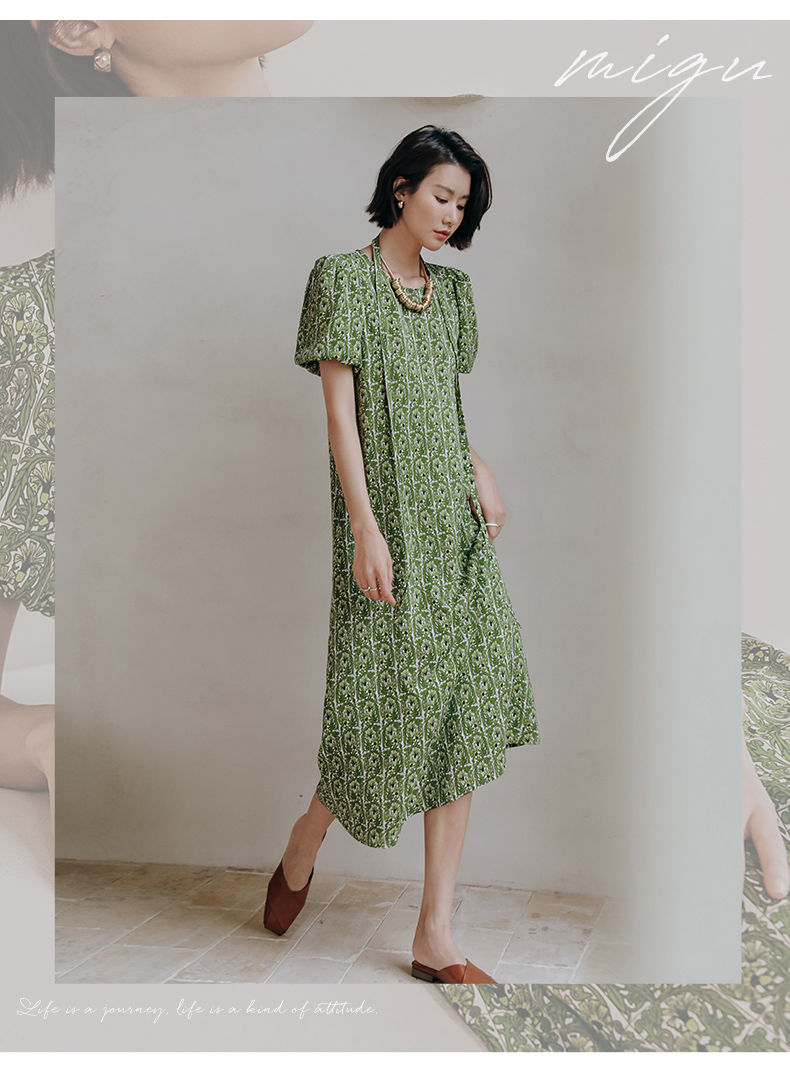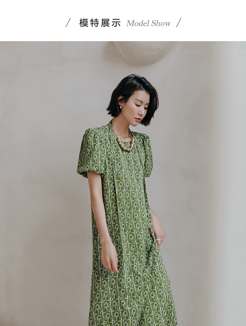 彌古法式復古綠色碎花連衣裙高級感茶歇長裙女夏顯瘦直筒海邊裙子