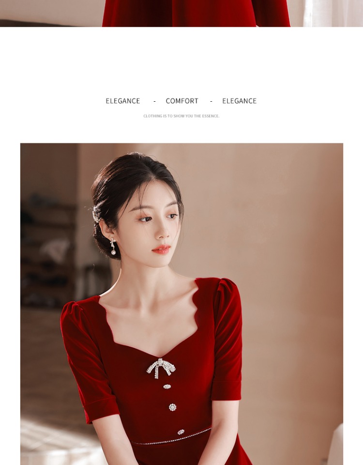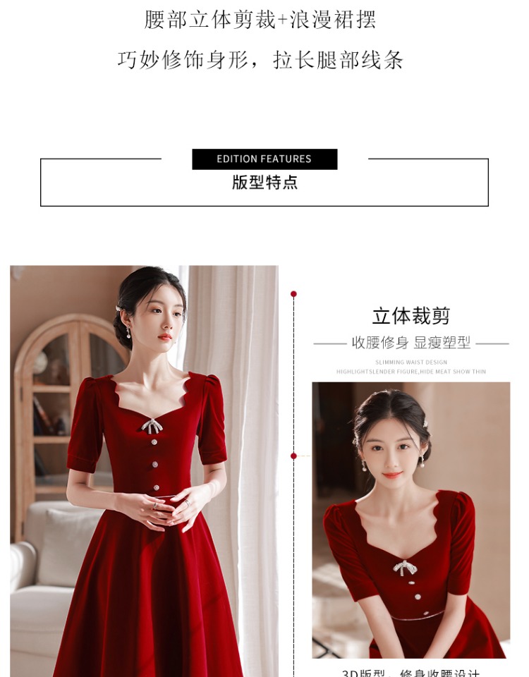 敬酒服新娘夏季酒紅色小個子訂婚連衣裙回門結婚禮服平時可穿v領
