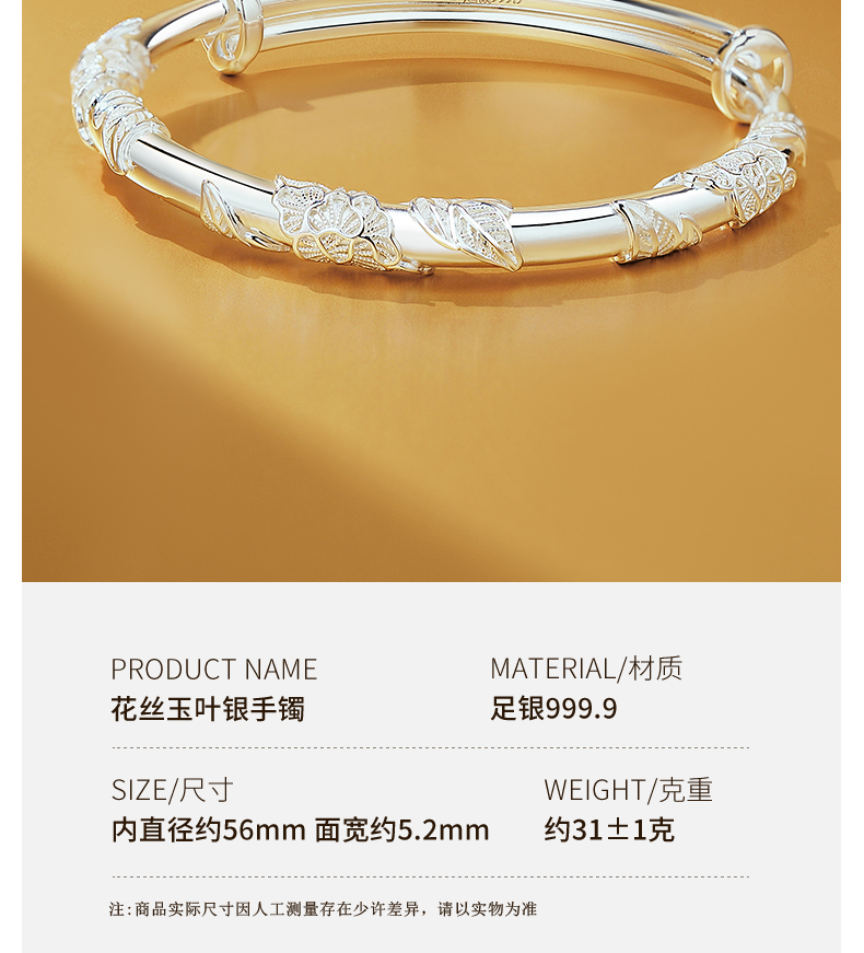繁花似錦純銀手鐲足銀9999閉口銀手環送女友生媽媽母親節生日禮物