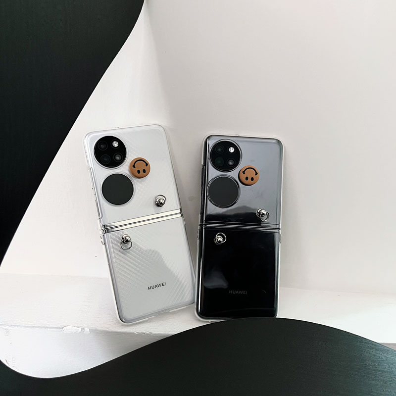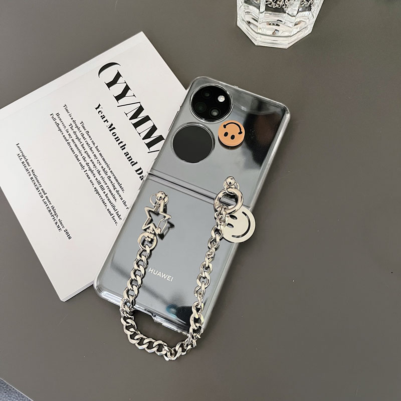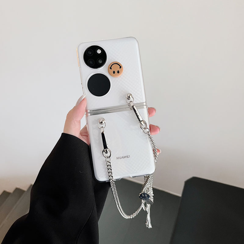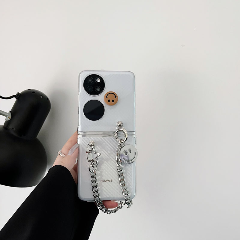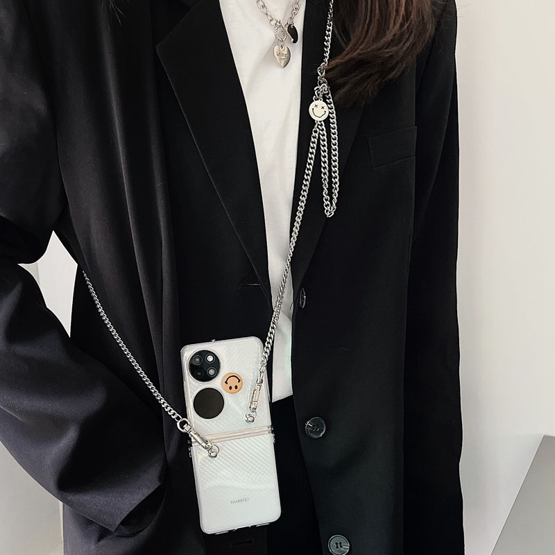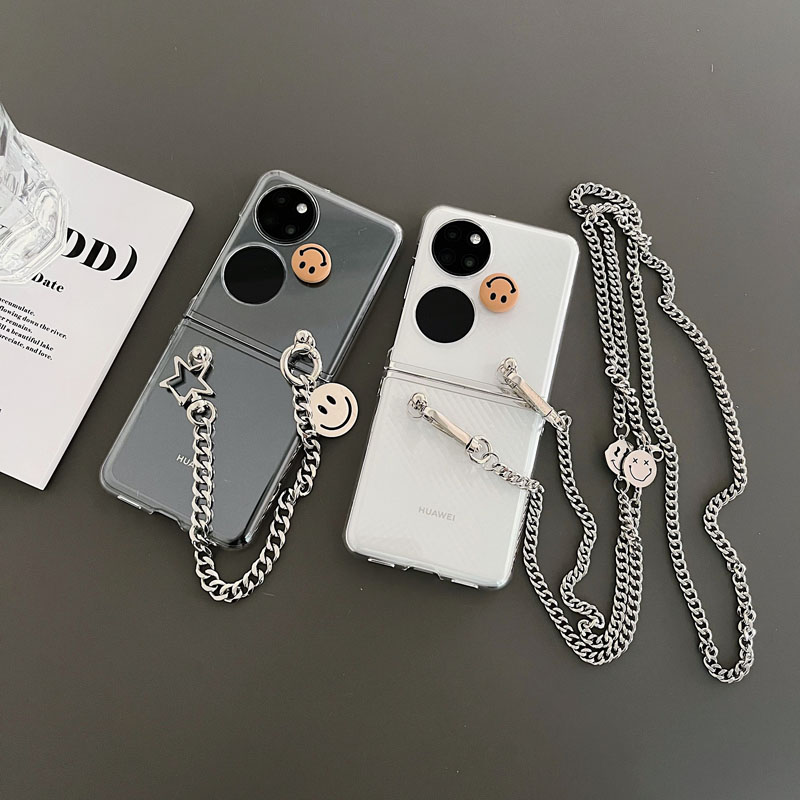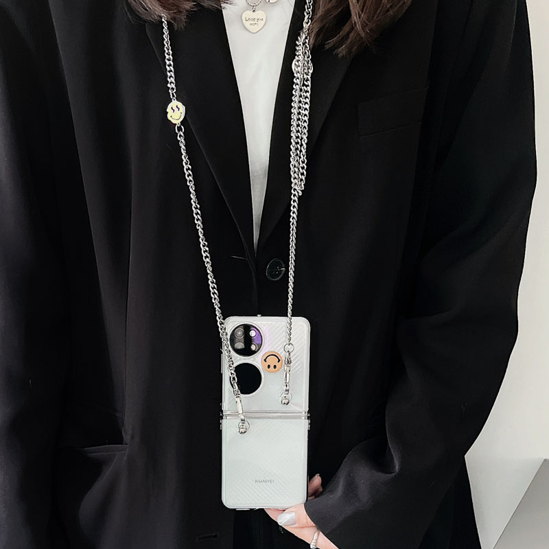 INS風簡約笑臉適用華為P50寶盒手機殼透明金屬斜挎長繩可愛卡通保護套P50 pocket S手提短手鏈折疊屏pocketS