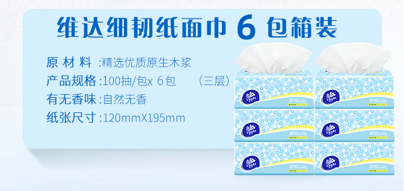 維達細韌抽紙100抽3層6包面巾紙衛生餐巾紙家庭實惠裝