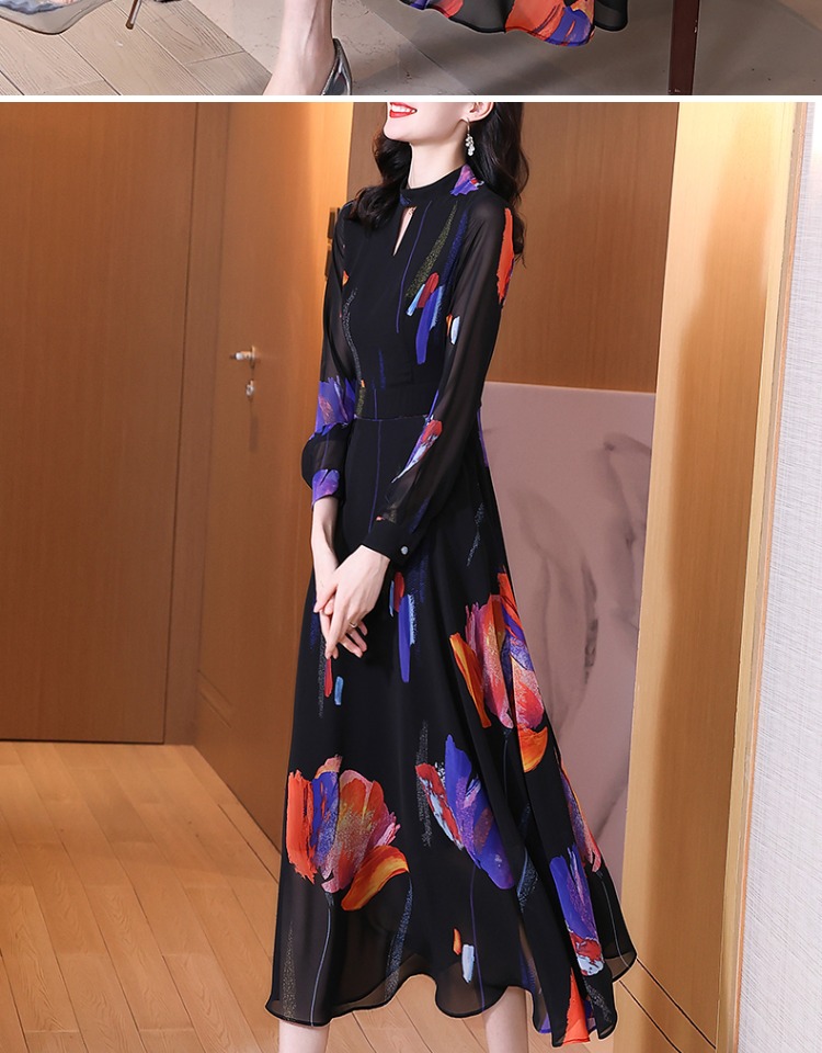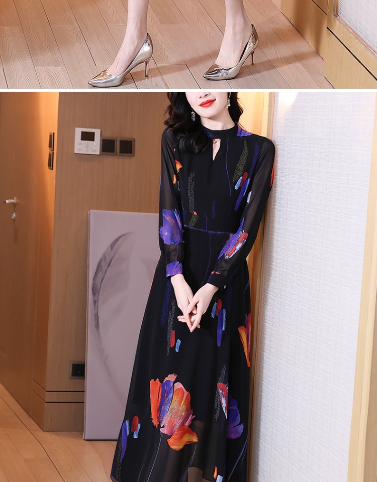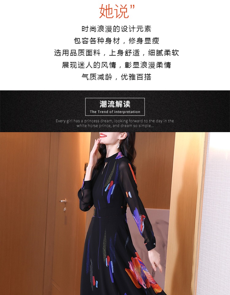 初秋2023新款紫色印花長袖連衣裙修身顯瘦高級感氣質V領a字大擺裙