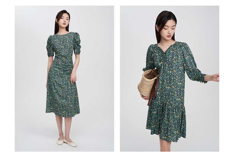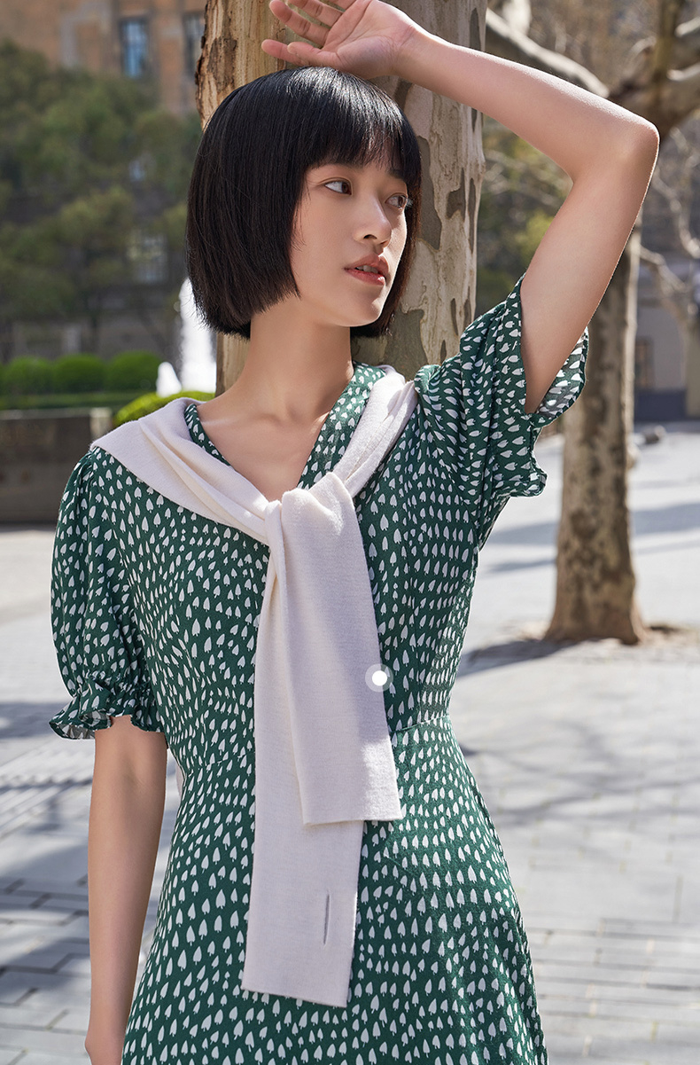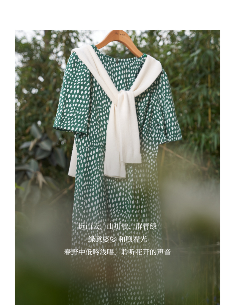 naivee納薇23春夏通勤復古法式印花V領泡泡袖收腰茶歇連衣裙綠色