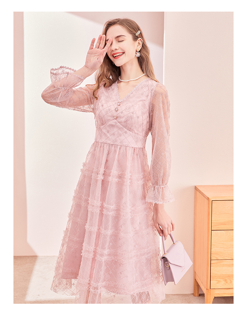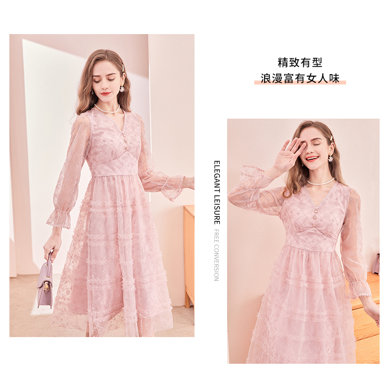 郁香菲連衣裙女2022新款秋季法式浪漫蕾絲網紗拼接收腰中長款裙子