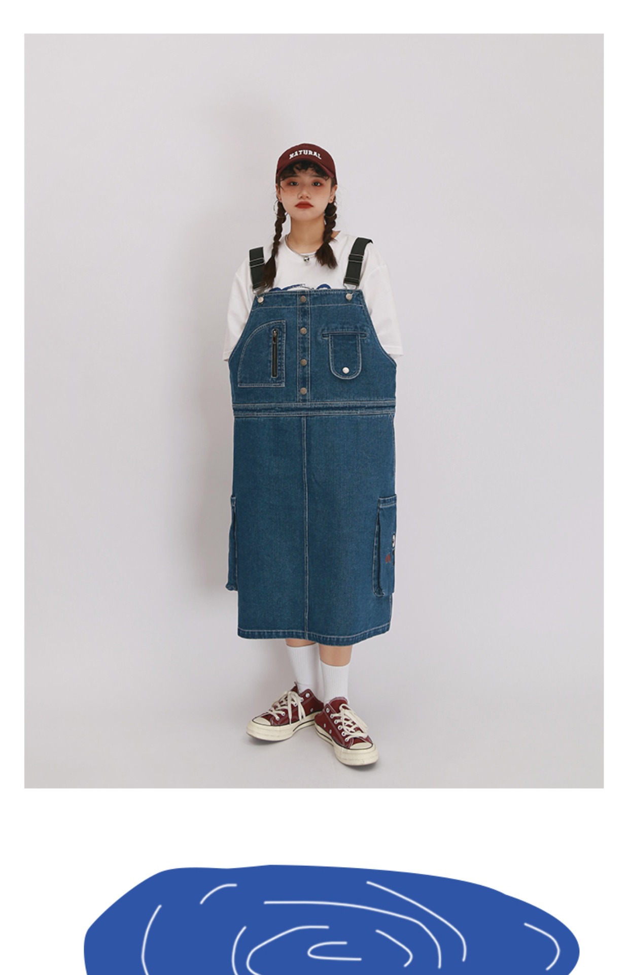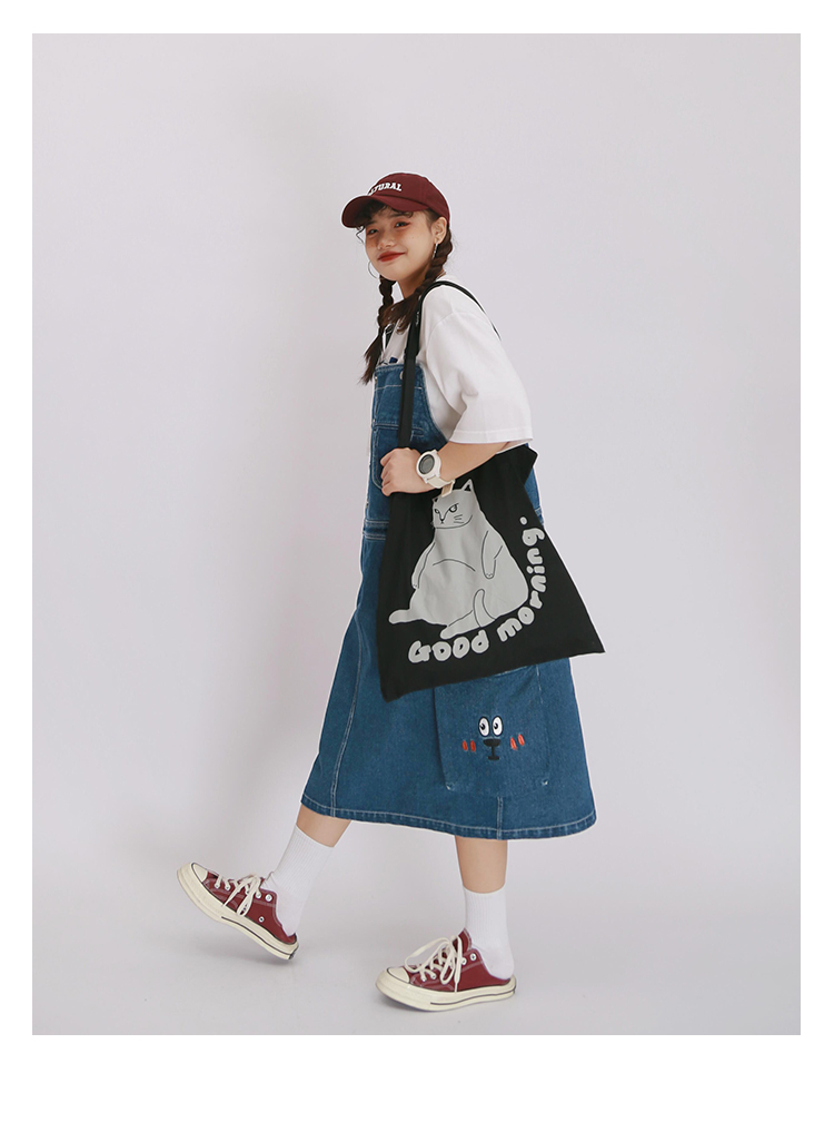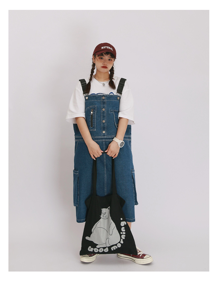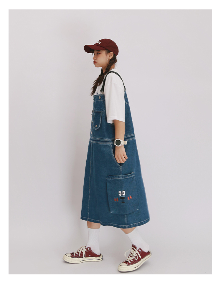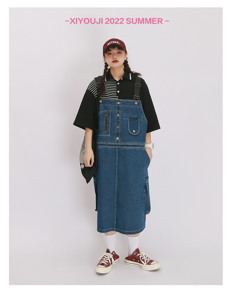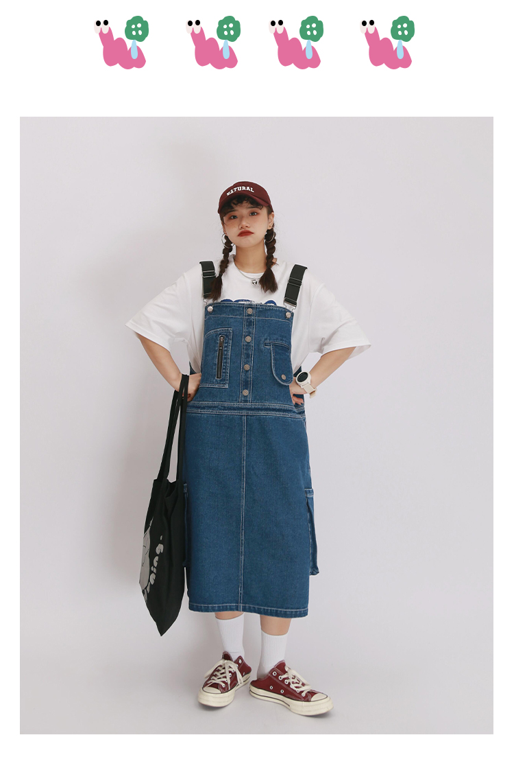嬉游記原創2022新款驚奇鬼減齡牛仔背帶裙女直筒寬松小個子連衣裙