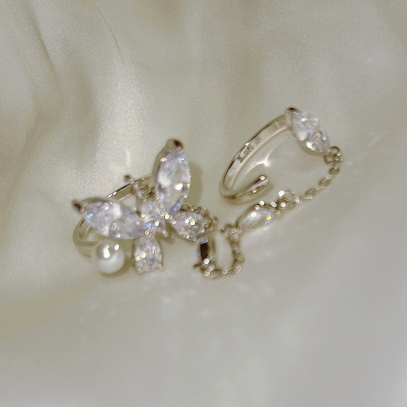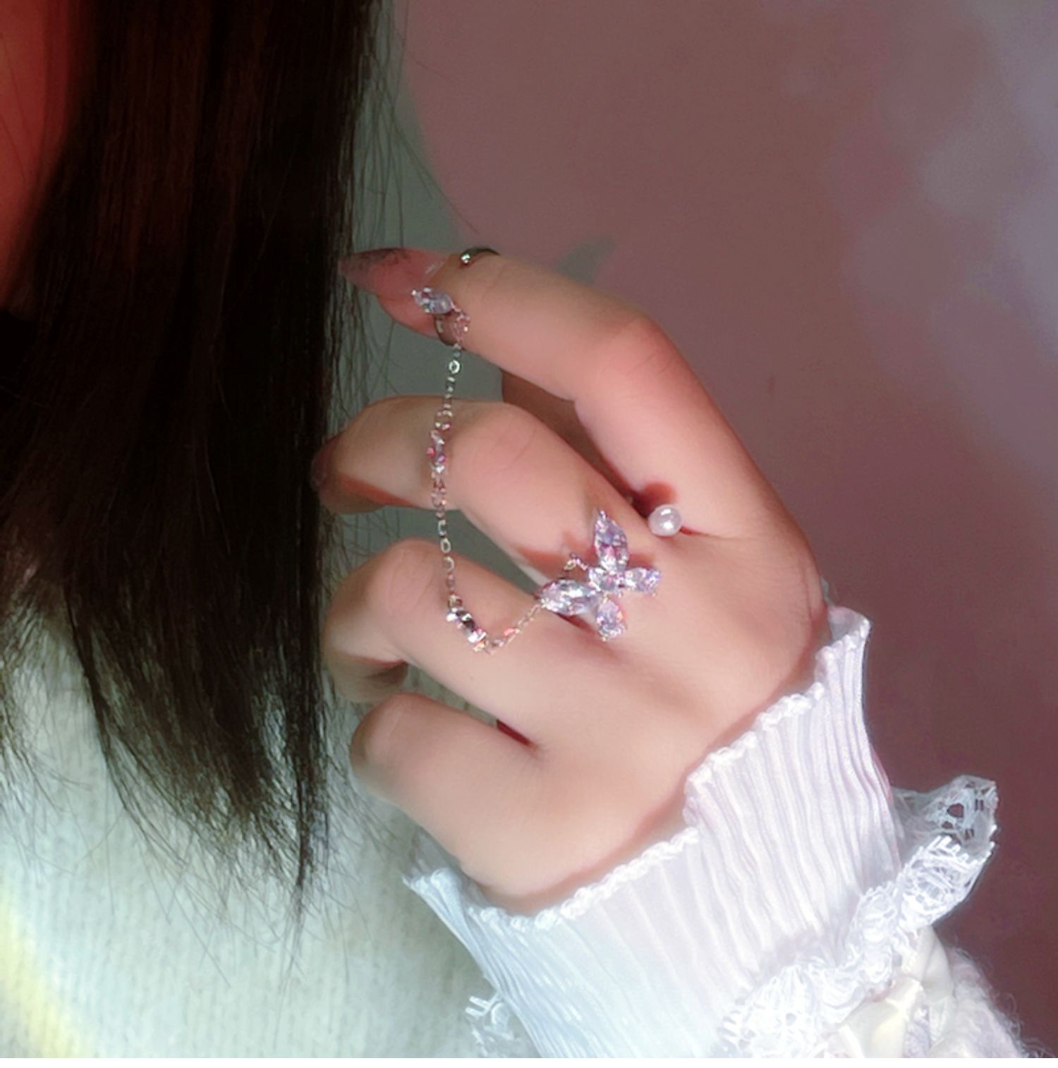 指間化蝶~連體鏈條蝴蝶珍珠戒指小眾設計高級感2021年新款潮女士