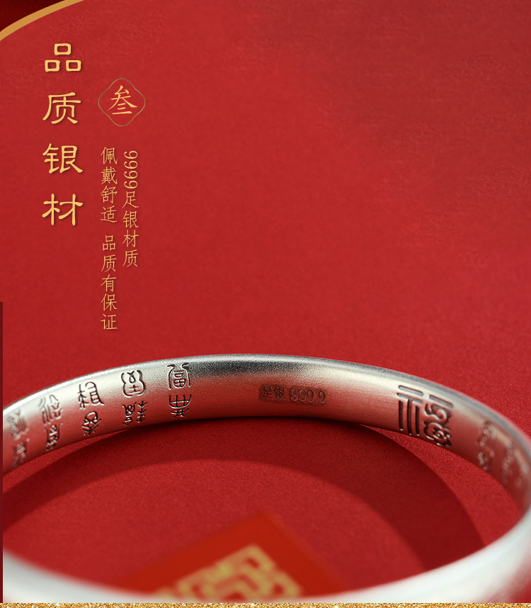 順欽銀樓S9999純銀手鐲情侶款錘紋吉言足銀鐲子民族風國潮手飾