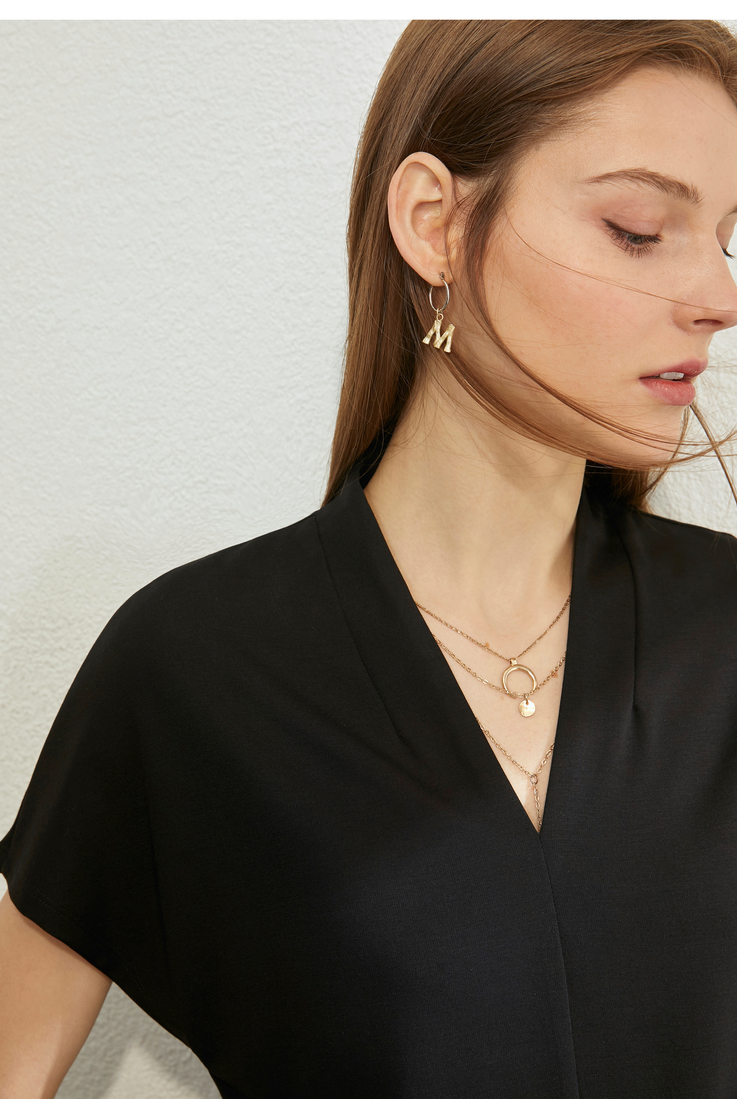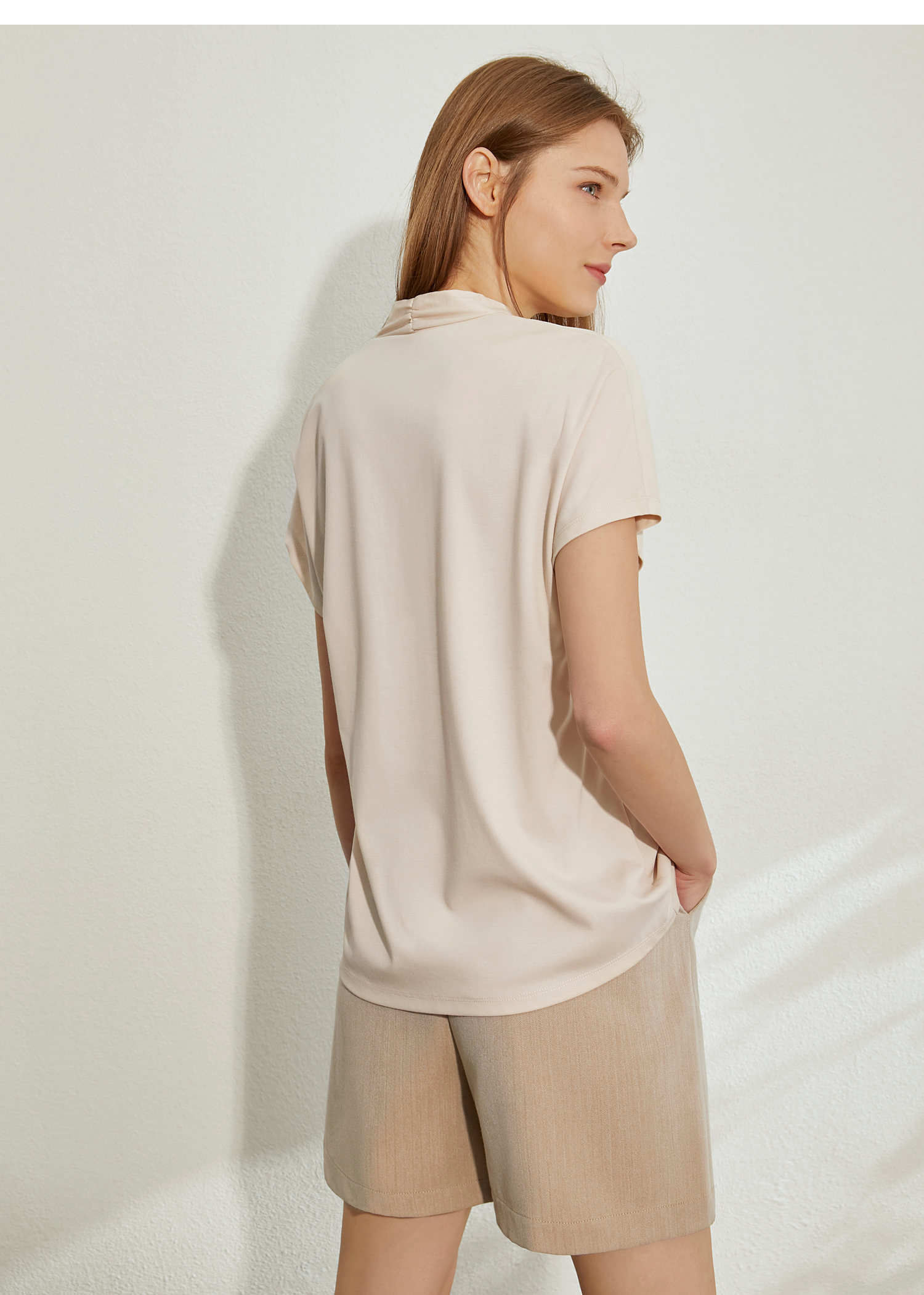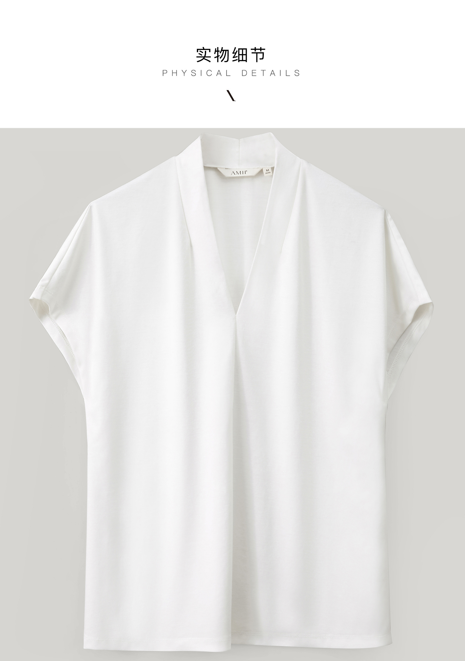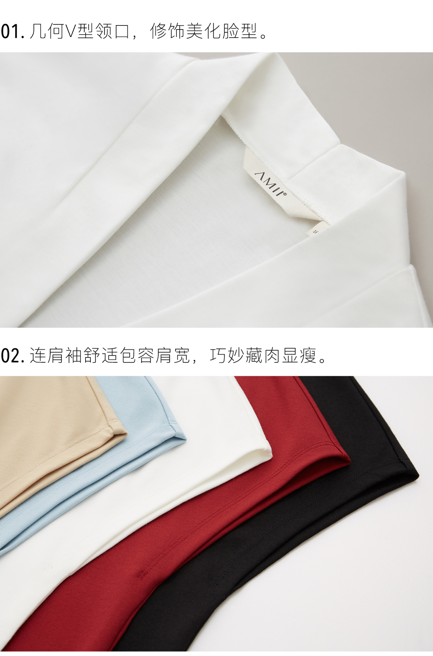 Amii2023春新款T恤氣質V領連肩短袖純色直筒60支彈力羅馬布上衣