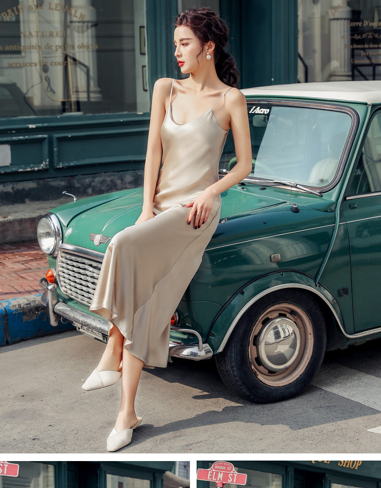 夏外穿醋酸緞面法式復古高腰吊帶裙