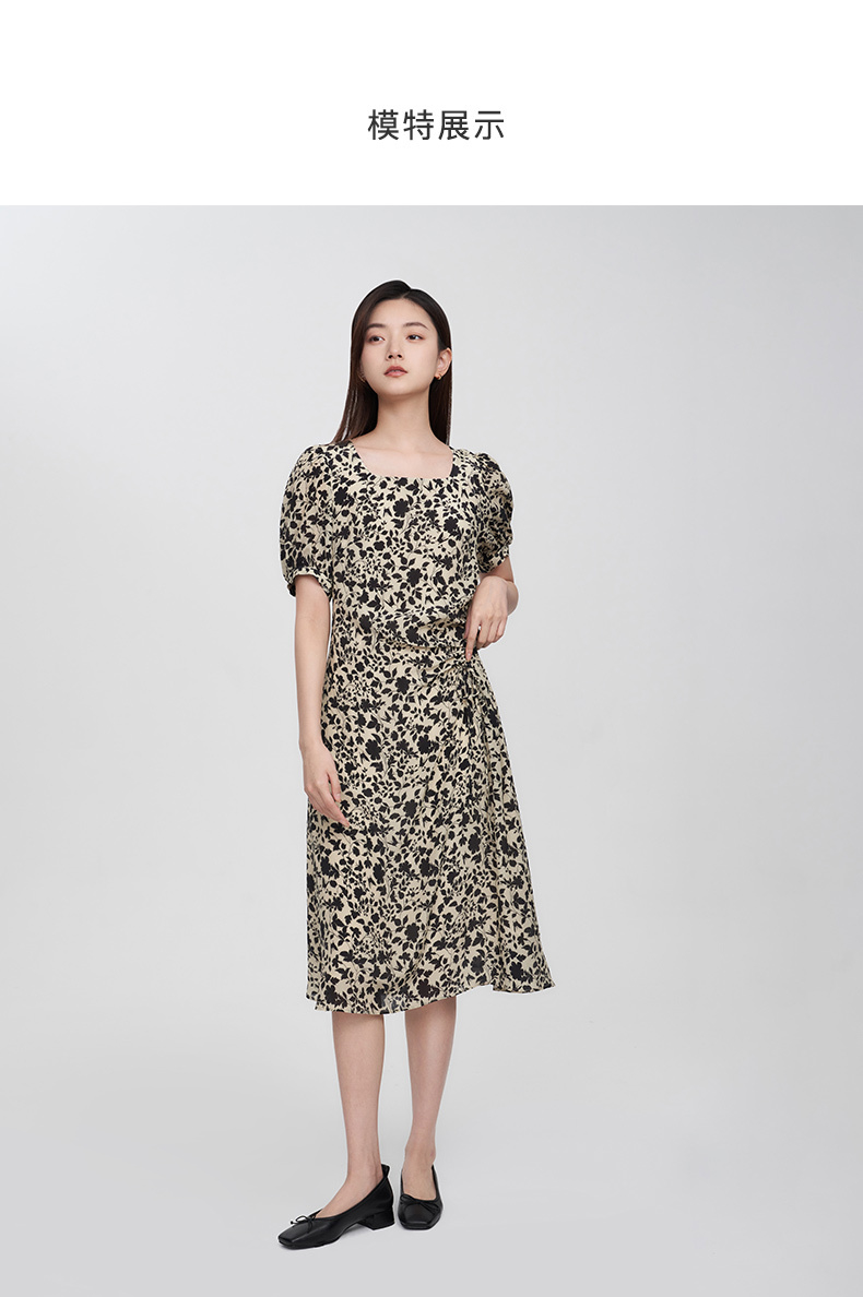 [買三贈一]商場同款naivee納薇復古法式印花方領泡泡袖收腰連衣裙