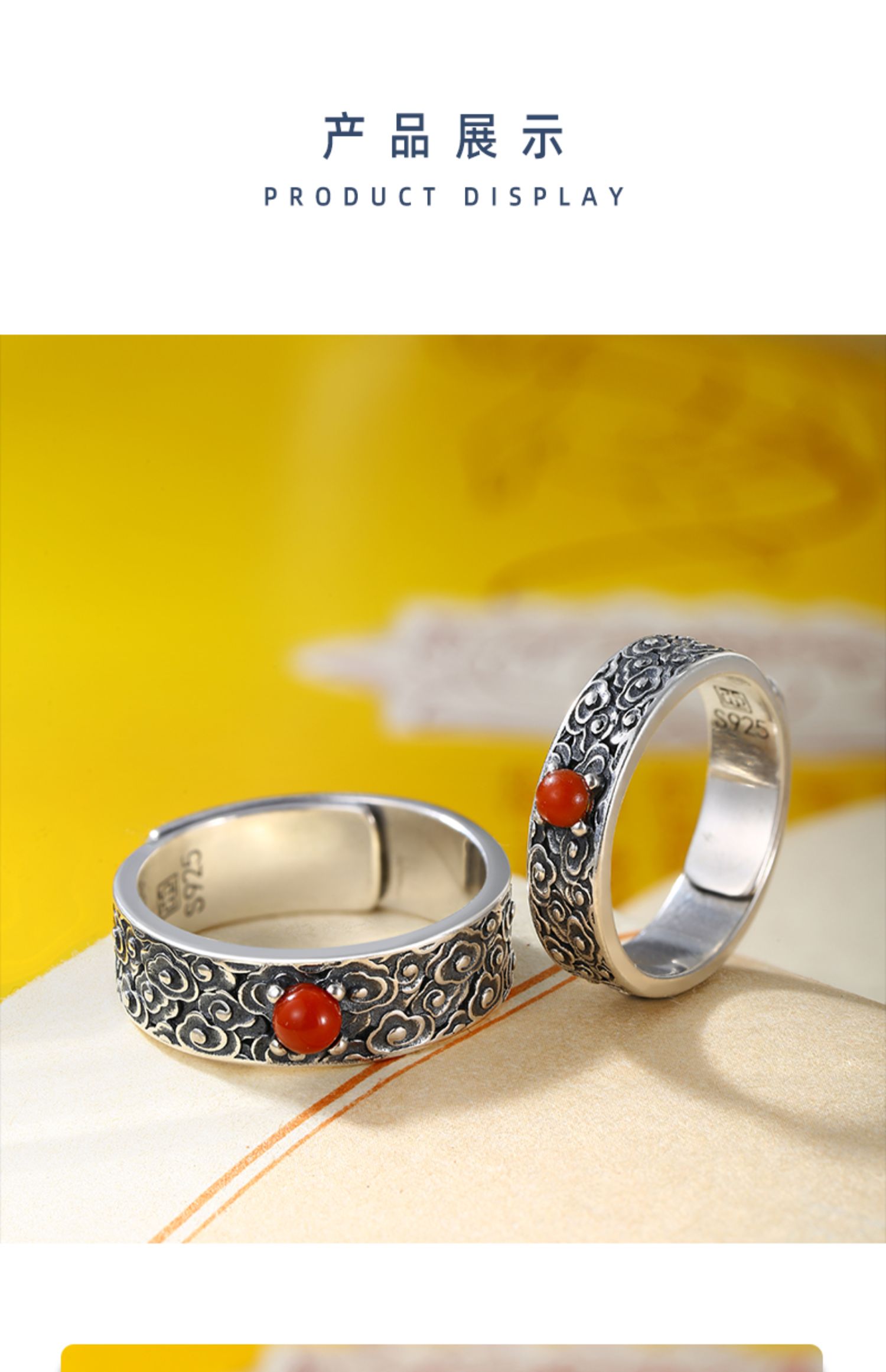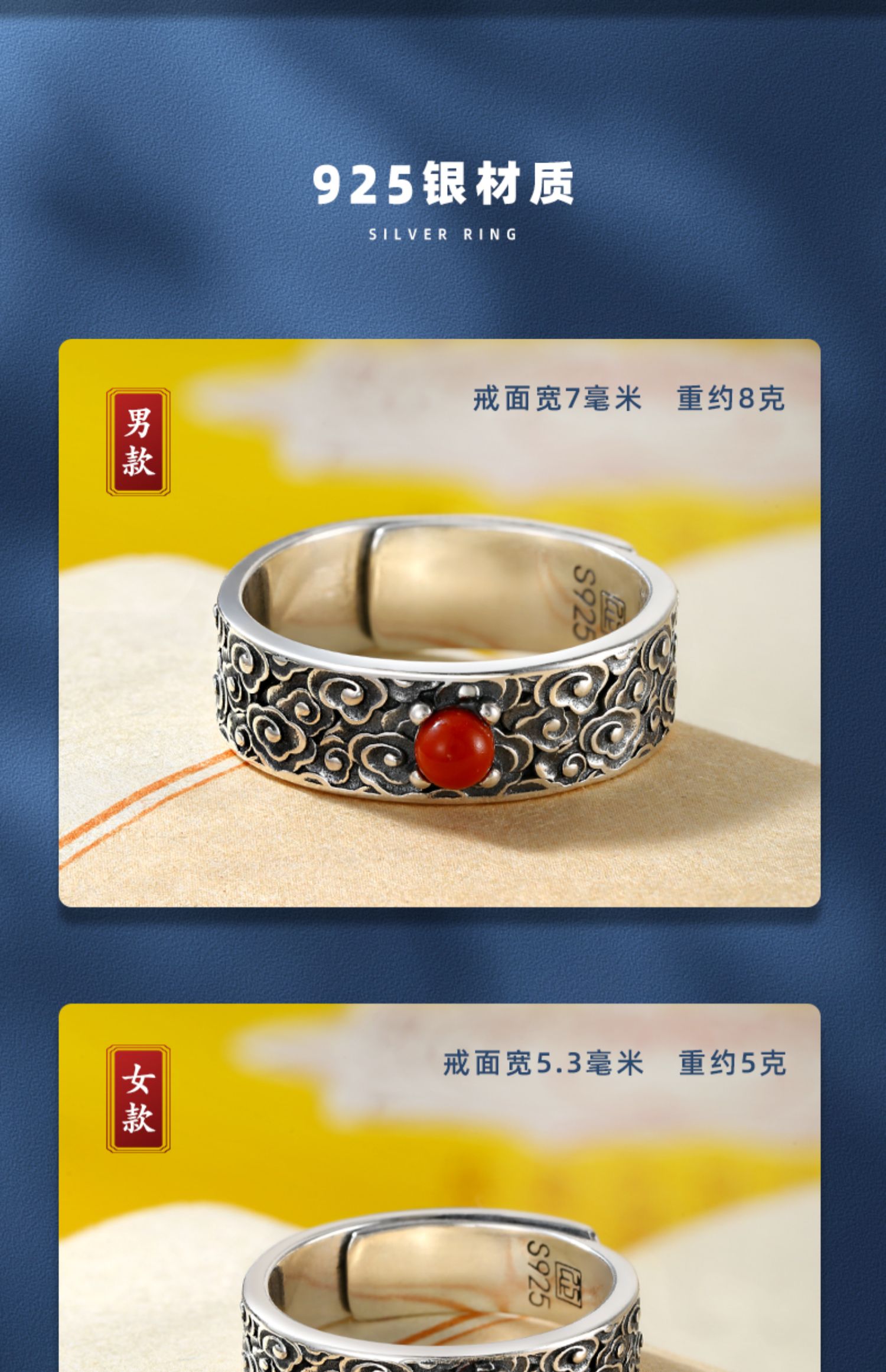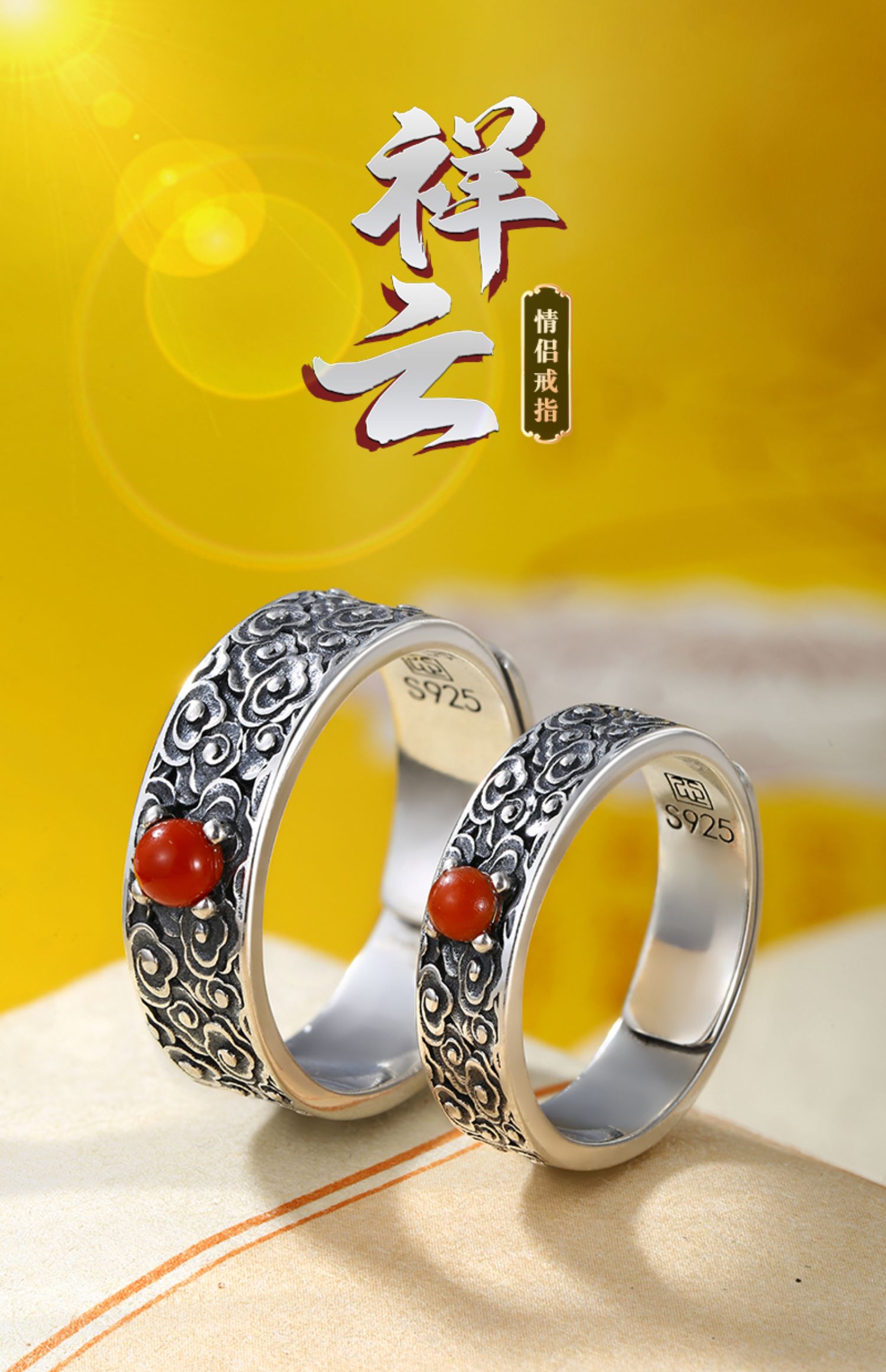 天然南紅石祥云情侶純銀戒指國潮個性男女生款潮人男士簡約送女友