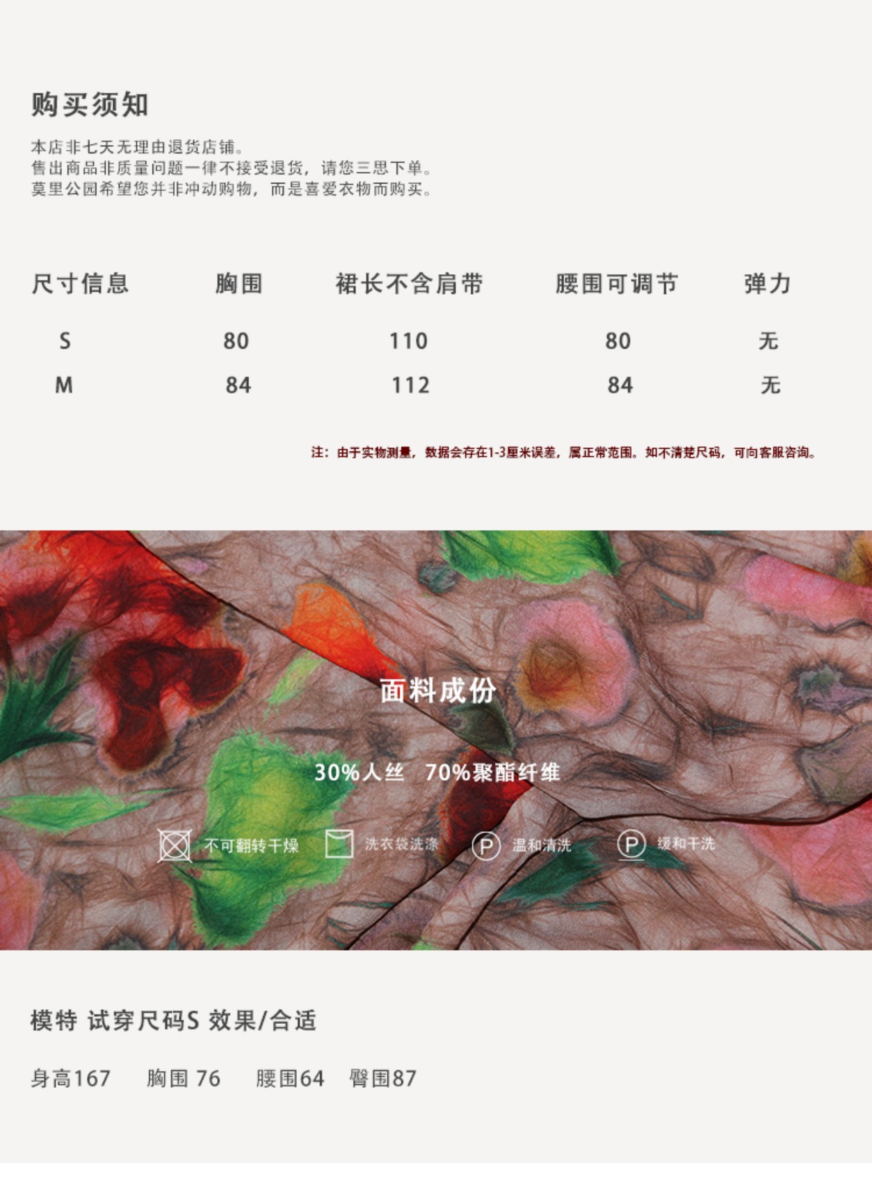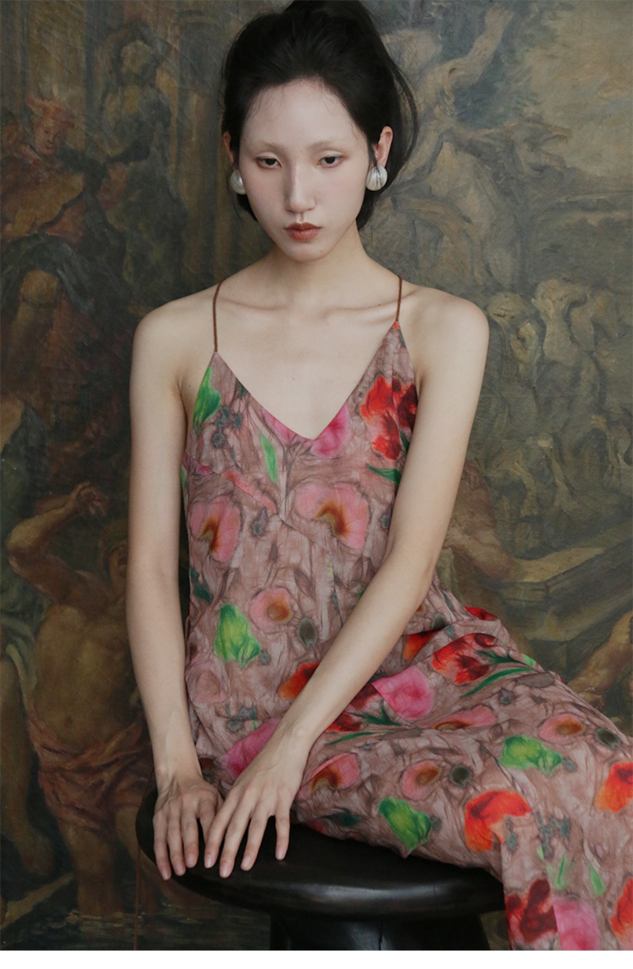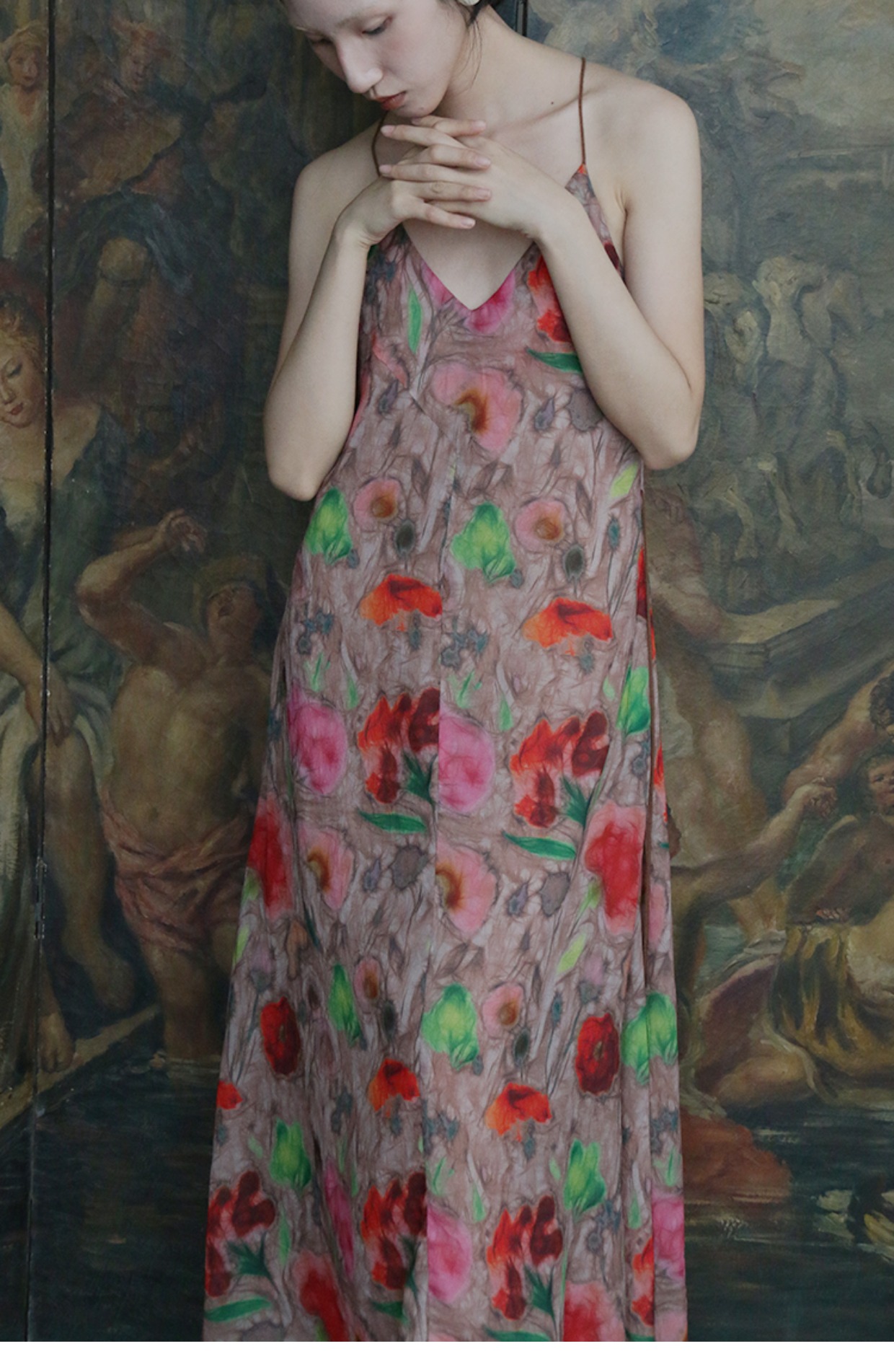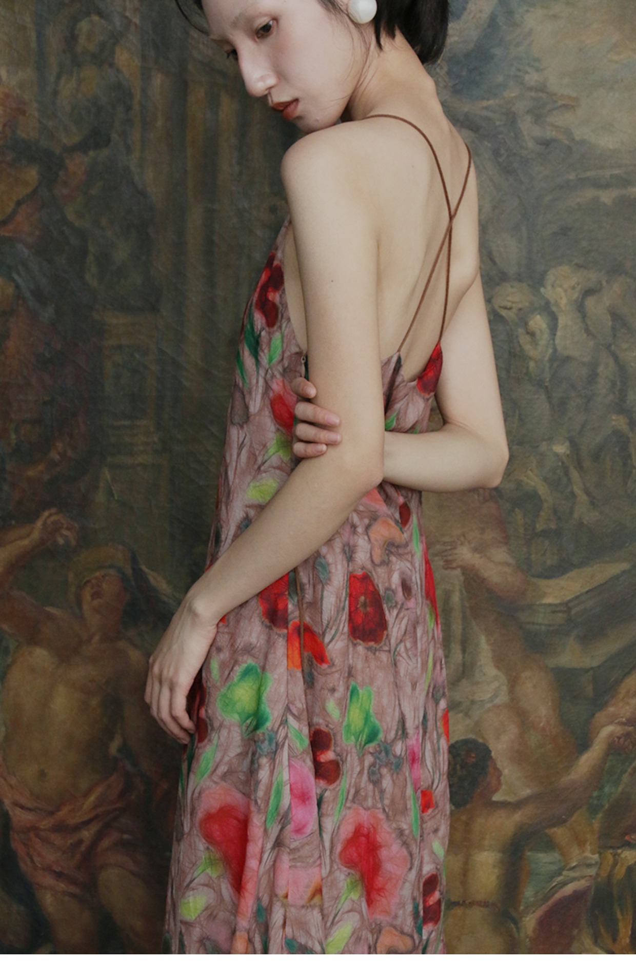 莫里公園 春夏新品小眾印花吊帶長裙 無袖V領古韻花卉圖案連衣裙