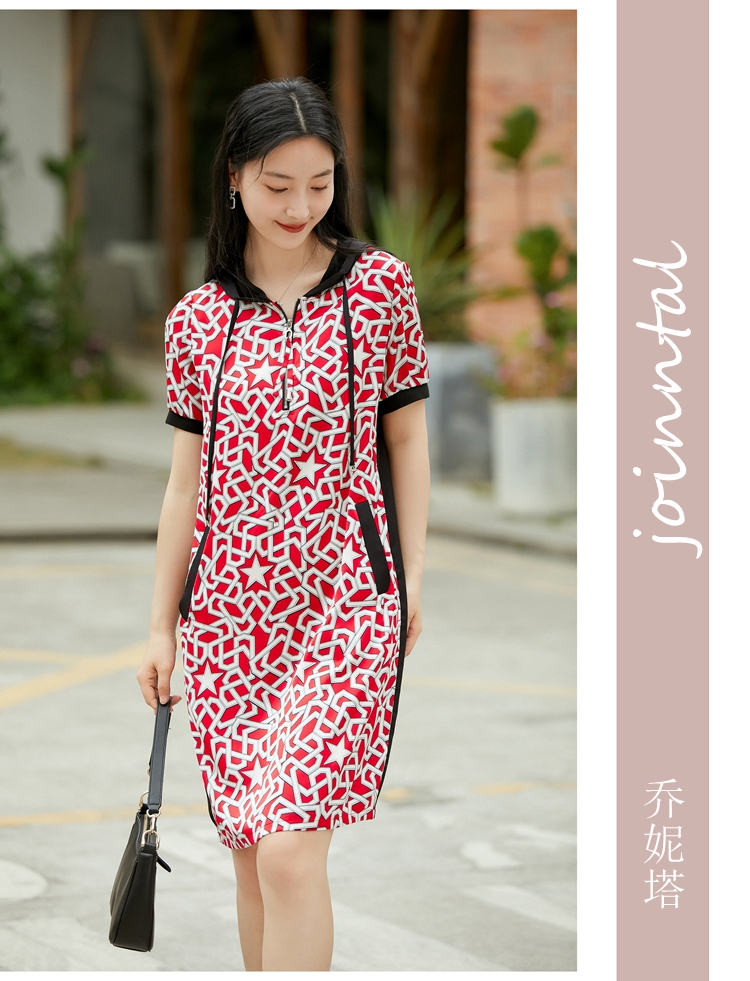 喬妮塔品牌女裝2023夏季新款連帽短袖中長寬松舒適休閑印花連衣裙