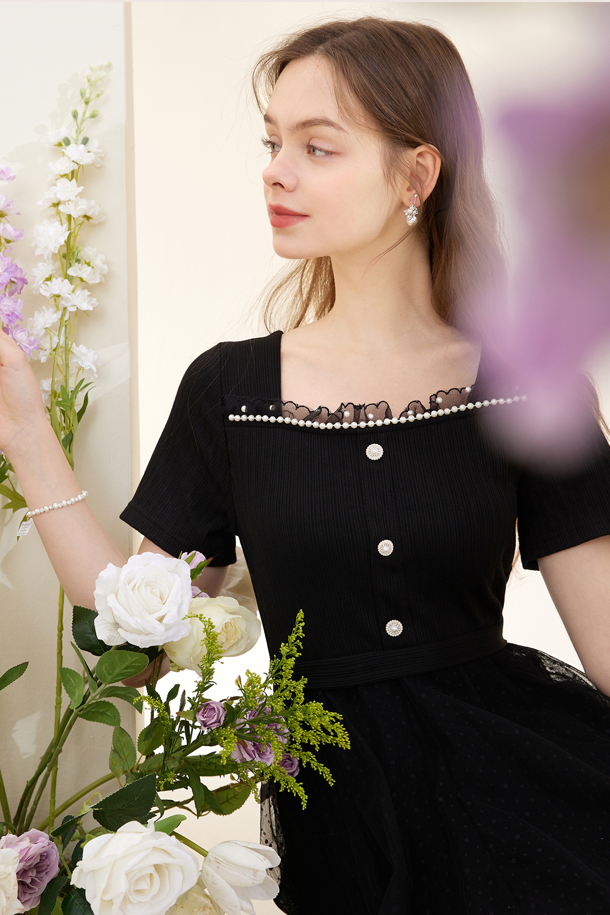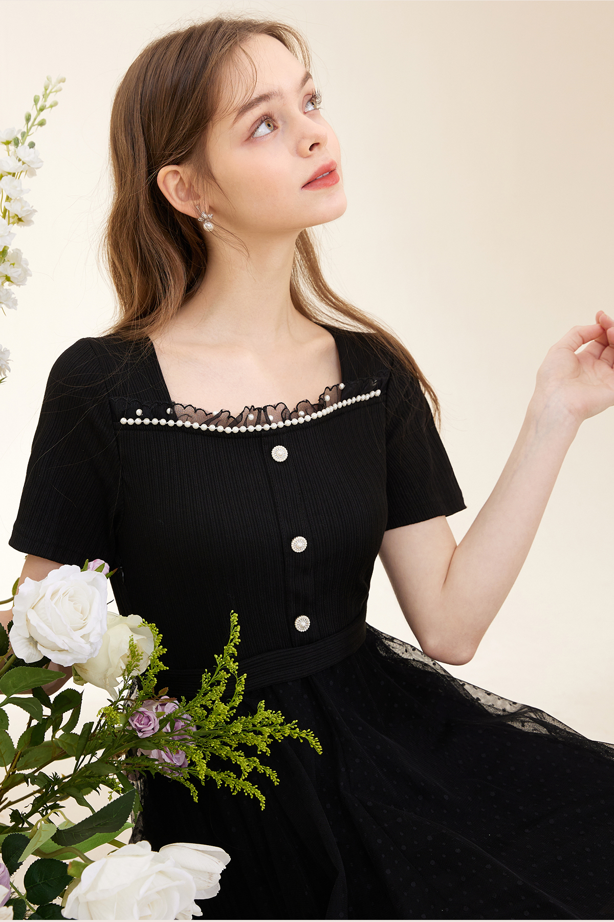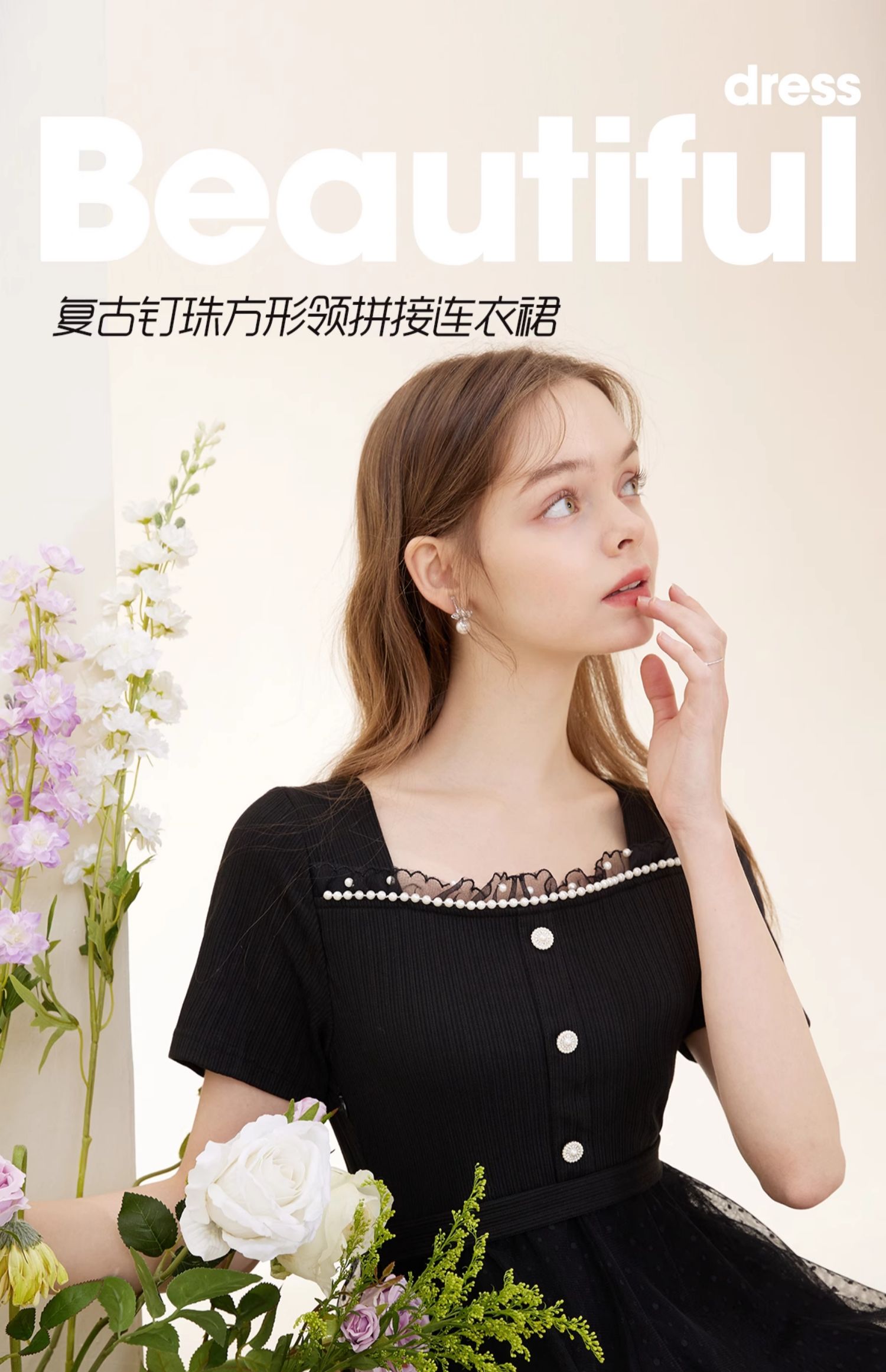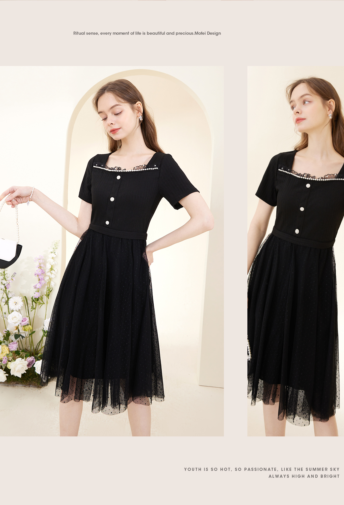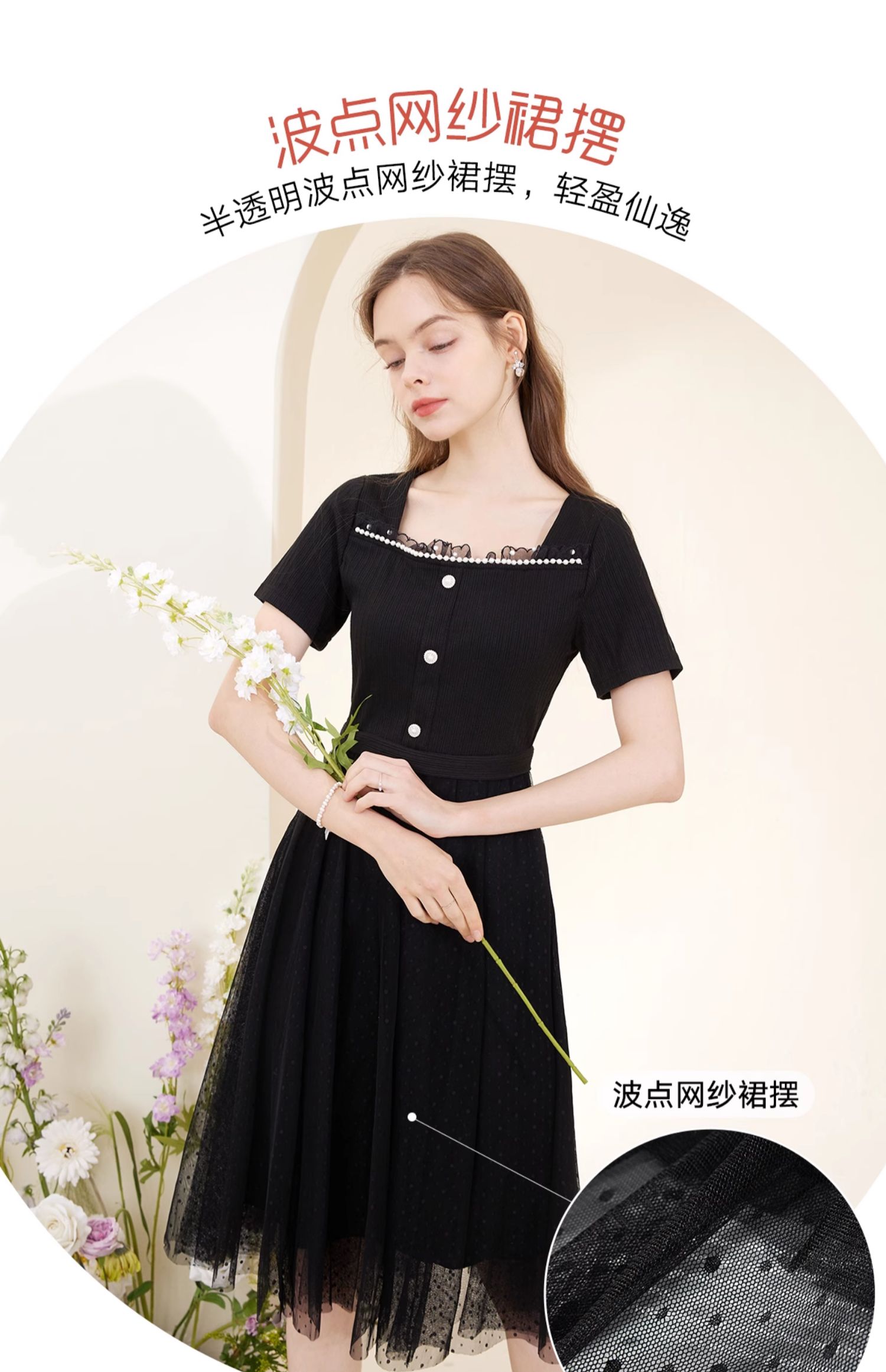景嫣黑色拼接連衣裙新款女夏收腰方領高貴設計感氣質網紗裙子
